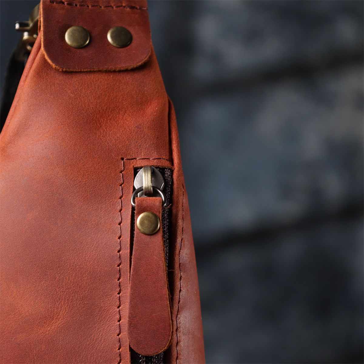 Чоловіча сумка-бананка із вінтажної рудої шкіри – яскравий акцент вашого образу. Ця сумка-бананка виготовлена з натуральної шкіри з виразною вінтажною фактурою та благородним рудим відтінком, який робить аксесуар по-справжньому помітним та стильним. Теплий рудий колір надає моделі індивідуальності, підкреслюючи природну красу матеріалу.