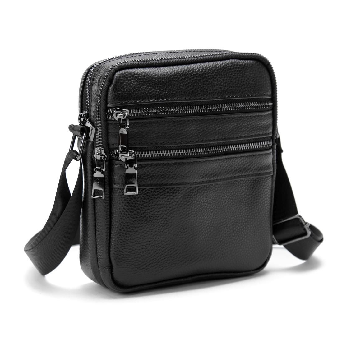 Сумка через плече Tiding Bag M56-3646A з натуральної шкіри в чорному кольорі, зернистої фактури. Розмір: 20 x 4,5 x 18 см. Чоловіча шкіряна сумка чорного кольору. Плечовий ремінь регулюється за довжиною. Два великих відділення на блискавці, з лицьового боку є дві додаткові кишені на блискавці, з тильного боку також є кишеня на блискавці. Підкладка: текстиль. Колір: чорнийКолір фурнітури: срібло.