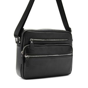 Сумка через плече Tiding Bag M56-9988A з натуральної шкіри в чорному кольорі, зернистої фактури. Розмір: 28 x 7 x 22 см. Чоловіча шкіряна сумка чорного кольору. Поверхня шкіри має зернисту структуру. Плечовий ремінь регулюється за довжиною. Одне велике основне відділення, є потайна кишеня на блискавці. З лицьового боку є три додаткові кишені на блискавці, з тильного боку також є кишеня на блискавці. Підкладка: текстиль. Колір: чорний. Колір фурнітури: срібло.