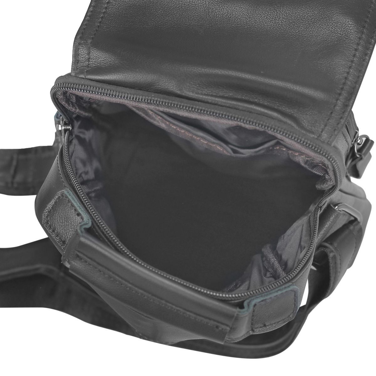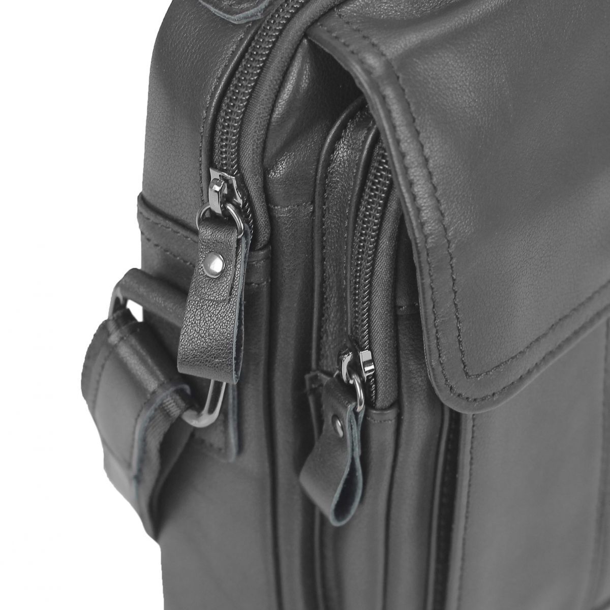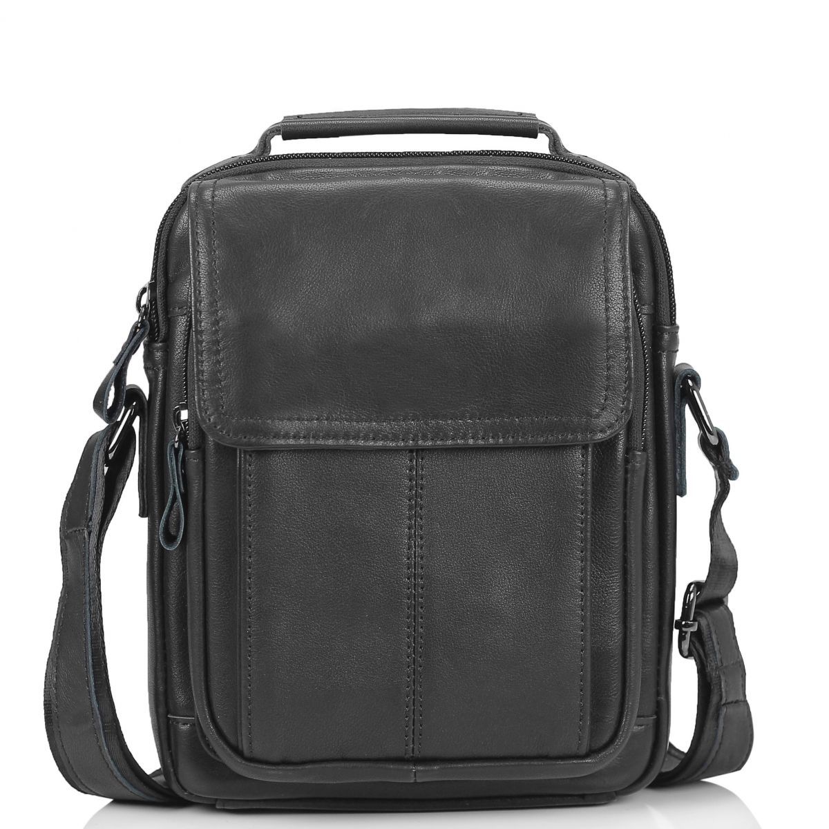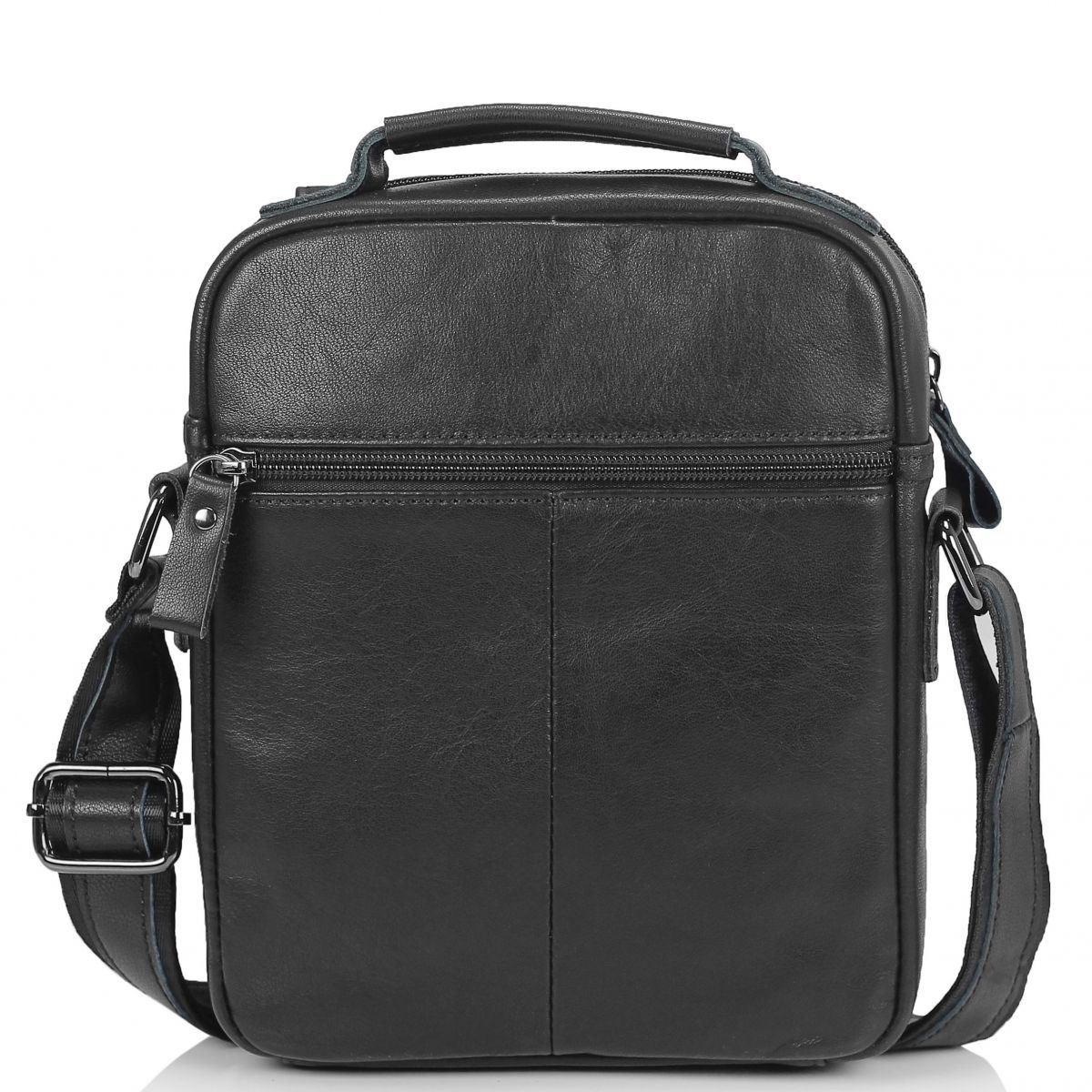 Чоловічий месенджер Tiding Bag N2-8017A виготовлений з натуральної шкіри чорного кольору. Структура шкіри зерниста. Розміри становлять 18 x 22 x 5 см. Особливості: має одне відділення яке закривається на блискавку. Всередині головного відділення є кишеня на блискавці з розміром 12х12 см і кишеня відкритого типу для дрібниць. З лицьового боку розташовані дві горизонтальні кишені, одна на блискавці з розміром 16х18 см, інша відкритого типу 12х14 см. Обидві кишені фіксуються клапаном з магнітною кнопкою. З задньої частини месенджер має кишеню на блискавці з розміром 16х10 см. Месенджер має середню жорсткість тому відмінно тримає форму. Підкладка - текстиль. Плечовий ремінь регулюється по довжині, в діапазоні 75-140 см. Зверху аксесуара розташована велика шкіряна ручка, що дає можливість носити сумку в руці. Колір чорний. Колір фурнітури: темне срібло.