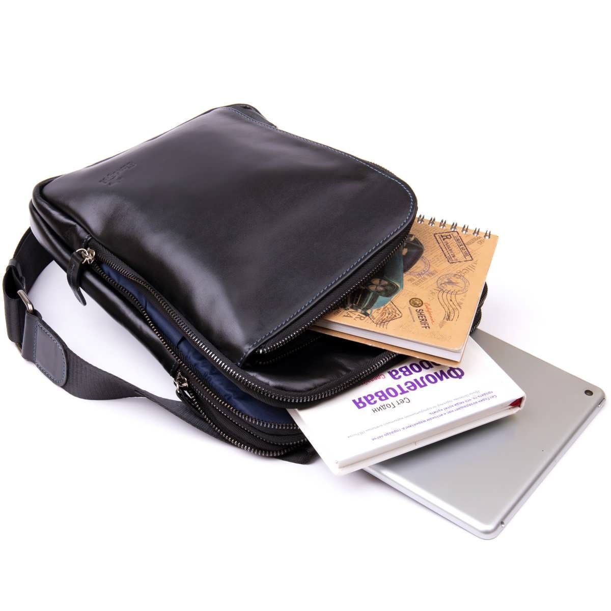 Шкіряна сумка для планшета в гладкій шкірі. Цей тип шкіри дуже невибагливий у догляді. Сумка підійде під будь-який ваш образ, підкреслюючи при цьому ваш відмінний смак. Модель чудово підійде щодня. По краях сумка прошита світлою ниткою в дизайні аксесуара. Усередині – синя підкладка із щільного текстилю. Сумка стане чудовим подарунком для будь-якого чоловіка та прослужить далеко не один рік.