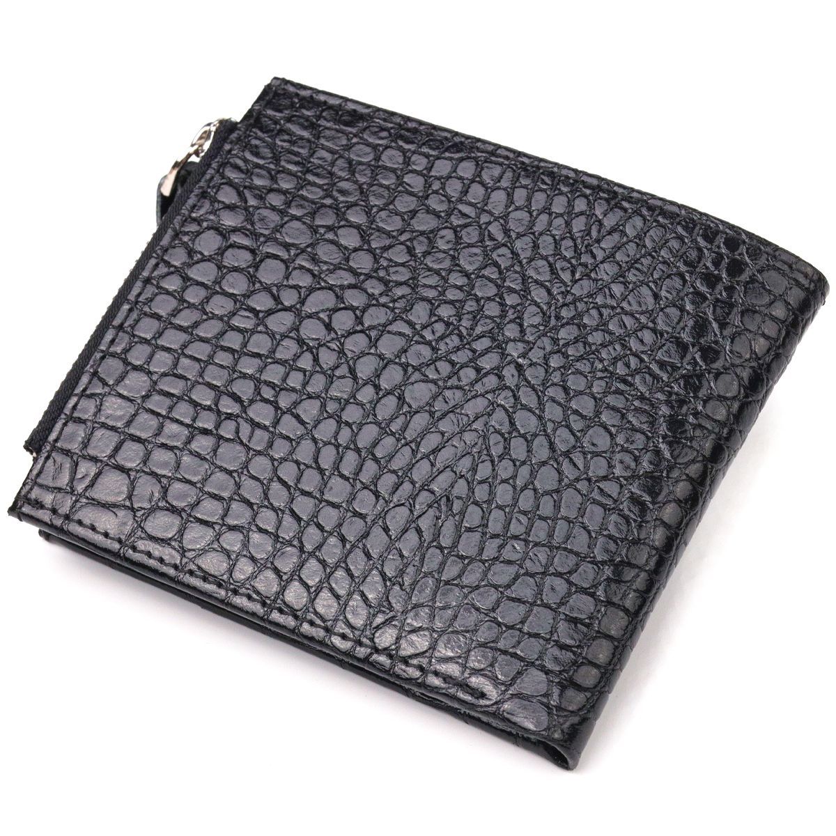 Оригінальний гаманець для чоловіків з натуральної фактурної шкіри з тисненням під крокодила. Аксесуар має одне основне відділення з перегородкою, до якого вміщуються купюри всіх номіналів, дев'ять кишень для карток, дві з яких під сіточкою, монетницю на блискавці, п'ять прилеглих кишень, а також автономний блок для карт, який розташований в одній із прилеглих кишень. Закривається аксесуар хлястиком на кнопку. Колір фурнітури – срібло. Шкіряний гаманець є чудовим подарунком для рідних та близьких людей.