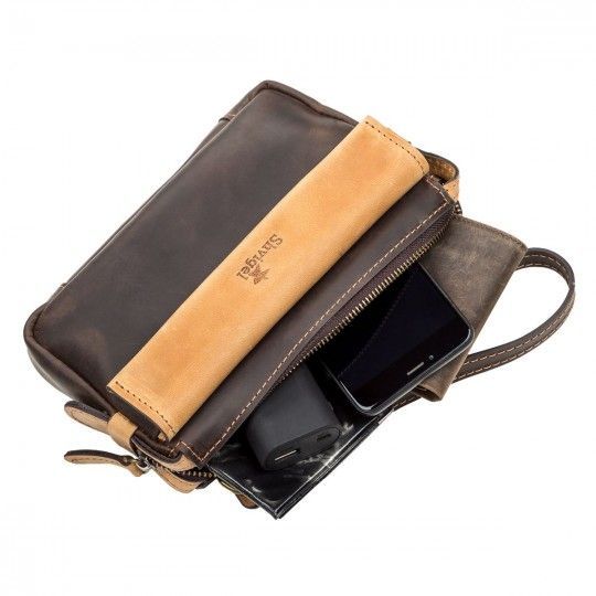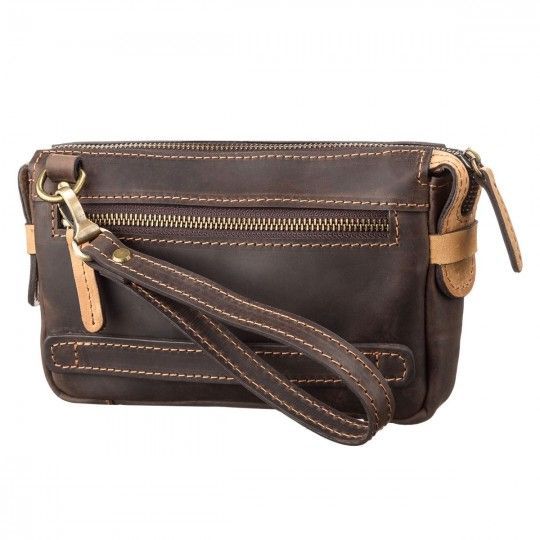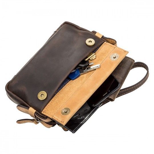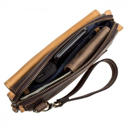 Містка чоловіча сумка-клатч з натуральної високоякісної вінтажної шкіри, особливістю якої є потертості і неоднорідність забарвлення. Аксесуар прошитий світлою коричневою ниткою, що надає виробу міцності та оригінального вигляду. Цей аксесуар не тільки функціональний у використанні, але й доповнює та підкреслює діловий, елегантний образ сучасного чоловіка.