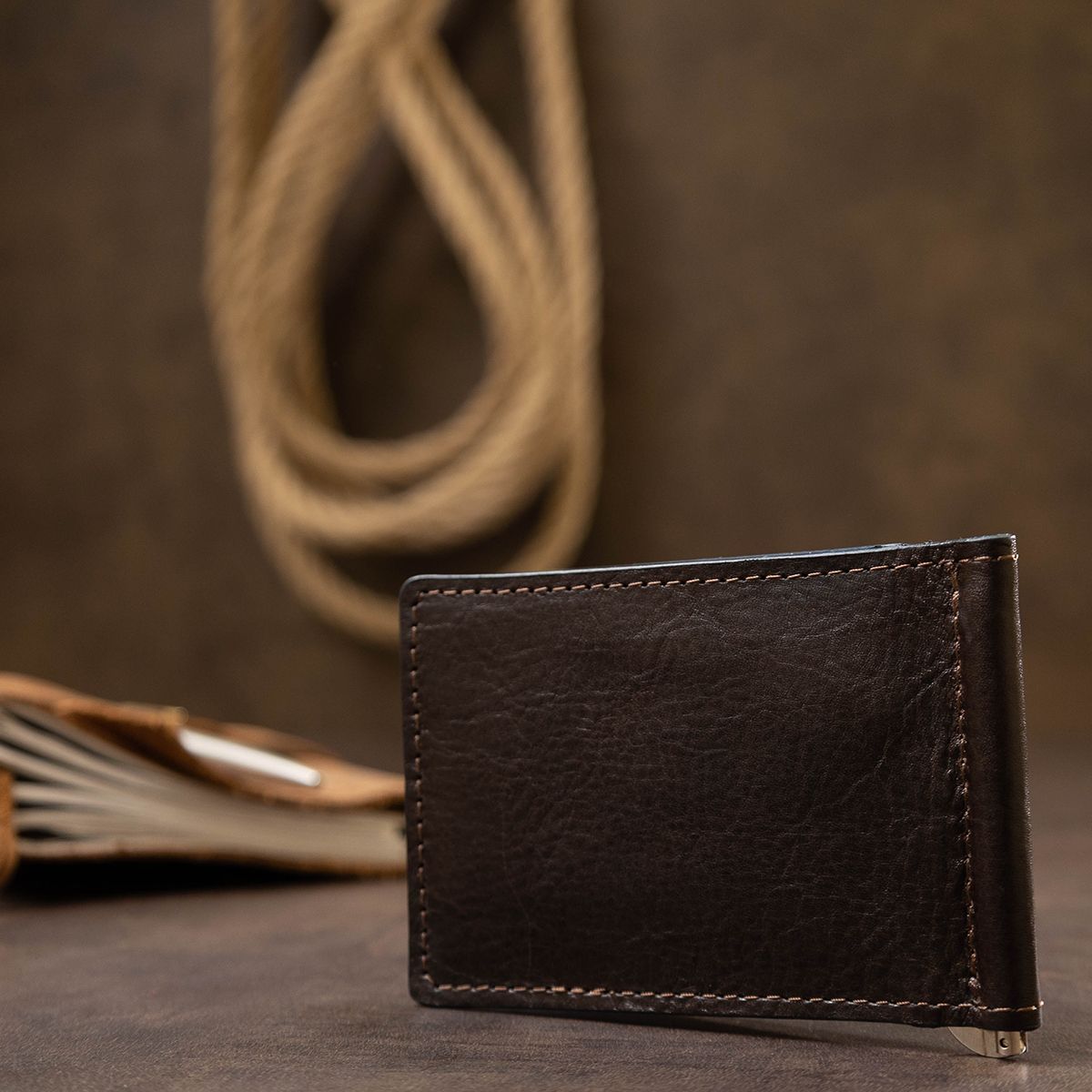 Високоякісний чоловічий затиск із натуральної зносостійкої шкіри від українського виробника. Виконаний у темно-коричневому стильному кольорі та має гладку глянсову фактуру. Усередині є затискач для купюр, слоти для карт та дві місткі кишеньки. Упакований цей аксесуар у фірмовий ущільнений чохол.