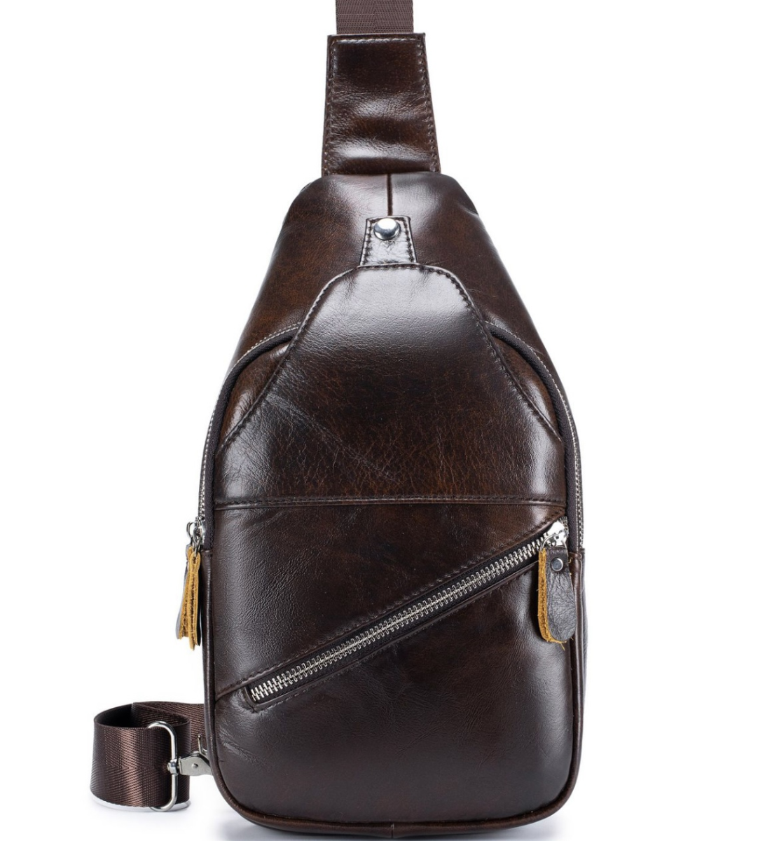 Шкіряна сумка через плече для чоловіків має 2 місткі відділення на блискавці. Лицьову сторону прикрашає металева кнопка та кишеня на змійці, що має дуже стильний вигляд. Сумка-слінг сподобається тим, хто любить брати із собою документи, портмоне та інші речі. Для ключів можна використовувати додаткову кишеню, розташовану з тильного боку аксесуара. А міцний ремінець шкіряної сумки можна прикріпити до будь-якого з двох карабінів, розташованих біля стінки.