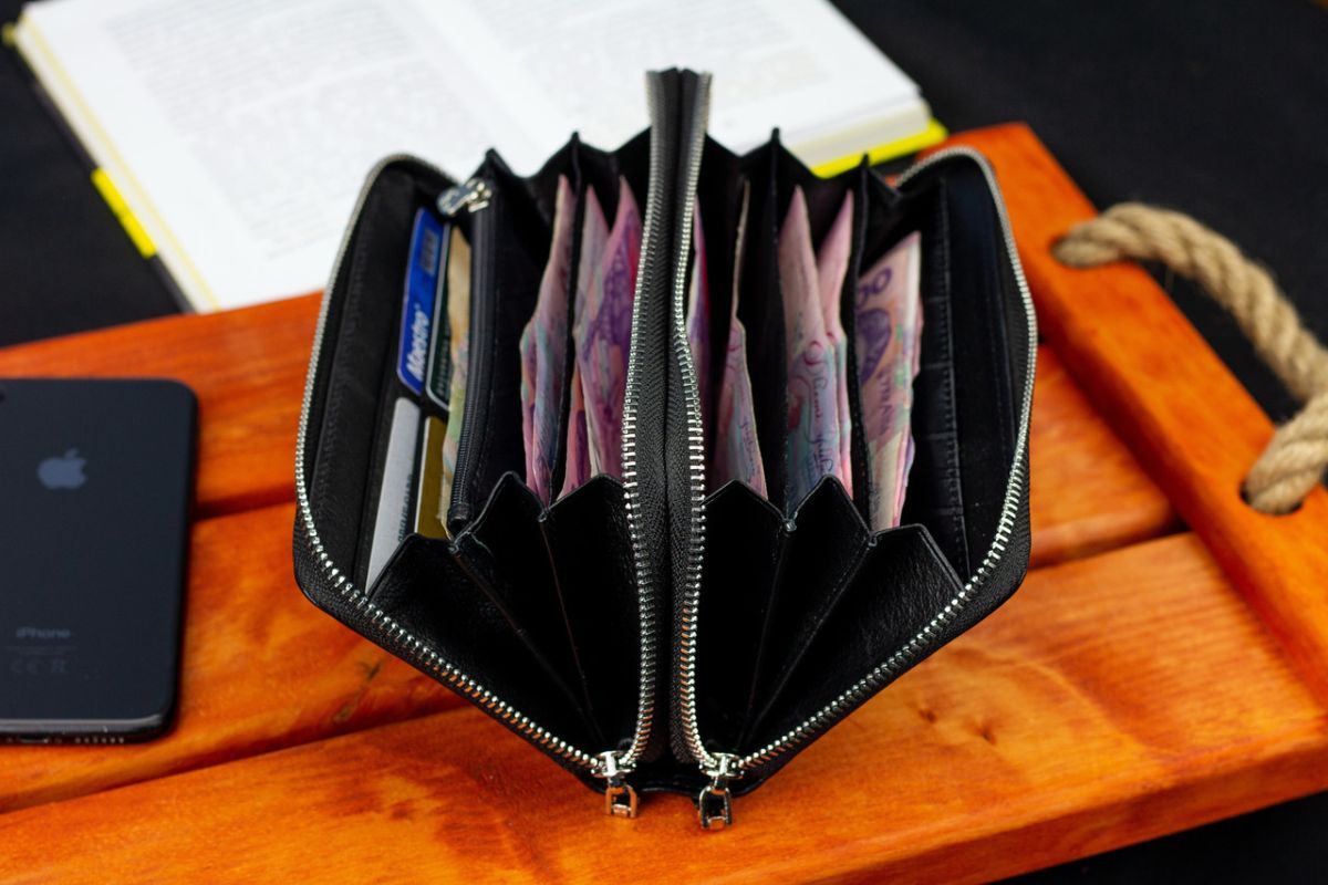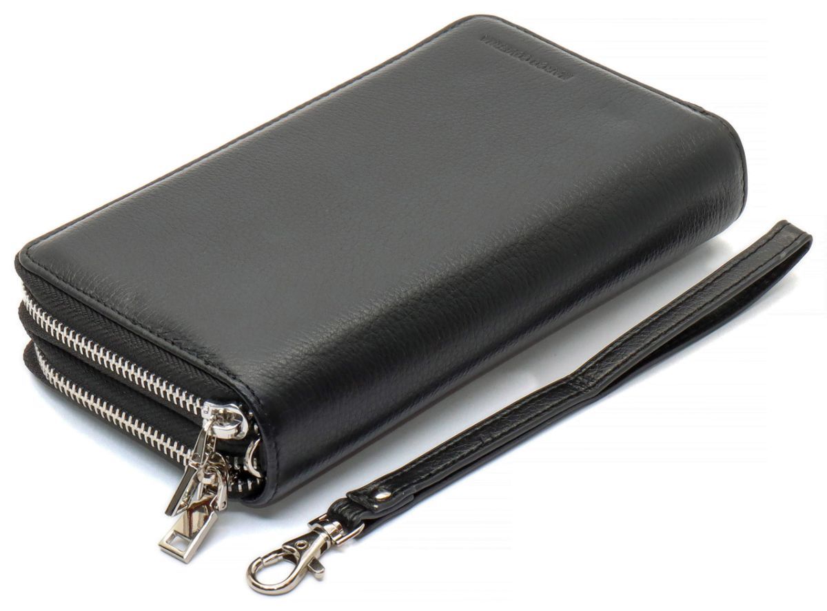 Чоловічий гаманець із двома роздільними відділеннями стане ідеальним рішенням для тих, хто розпоряджається великими сумами грошей. У кожній частині знаходиться по 3 вмістовні секції для купюр. Крім того, в одній з них є кишеня-перегородка на блискавці, в якій зручно зберігати монети. Місцем для кредитних карток є секції на стінках шкіряного чоловічого гаманця. Носити виріб дуже зручно, оскільки в ньому передбачено ремінь на долоню, а також ремінець, що знімається на зап'ястя.