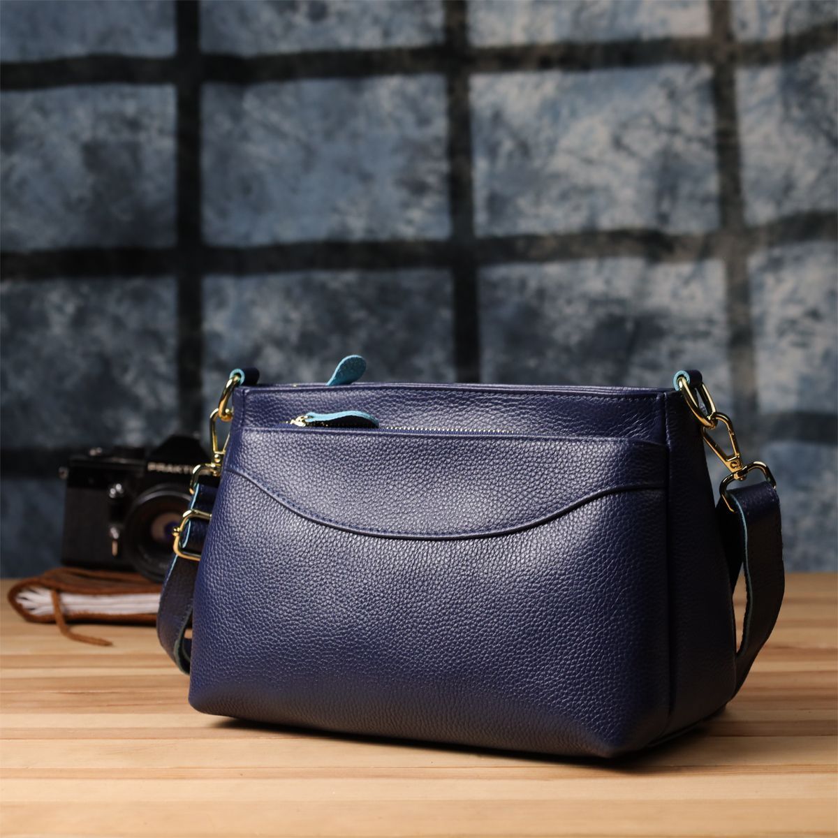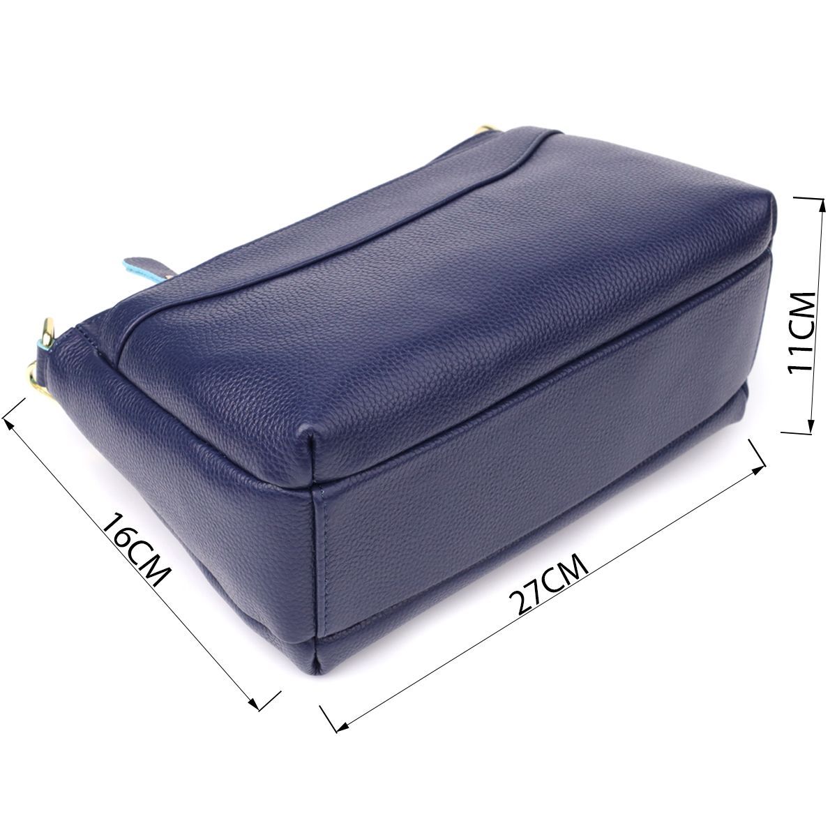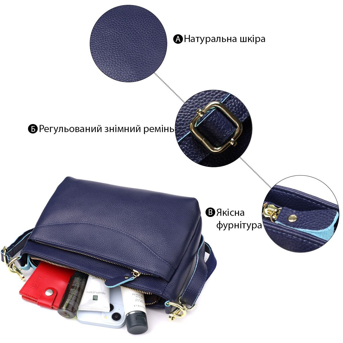 Ця синя шкіряна сумка з формостійким дном — чудовий вибір для сучасної жінки, яка цінує поєднання якості, дизайну та зручності.