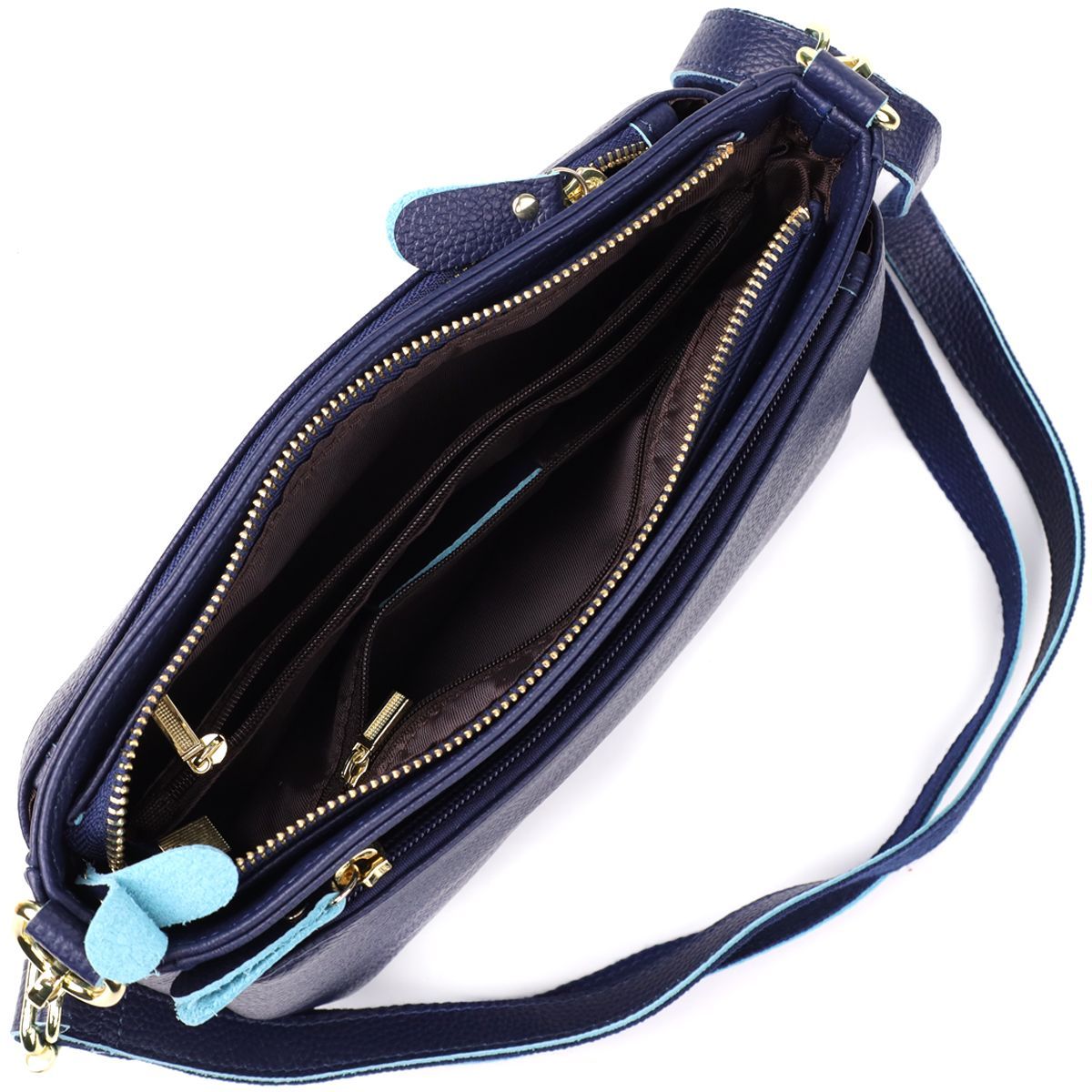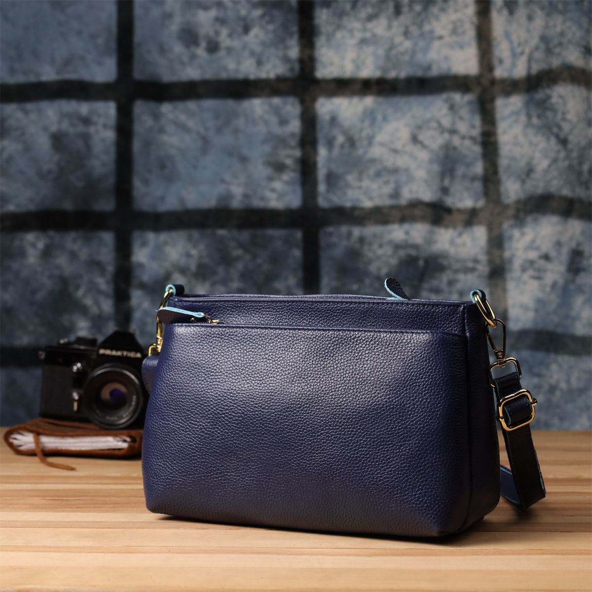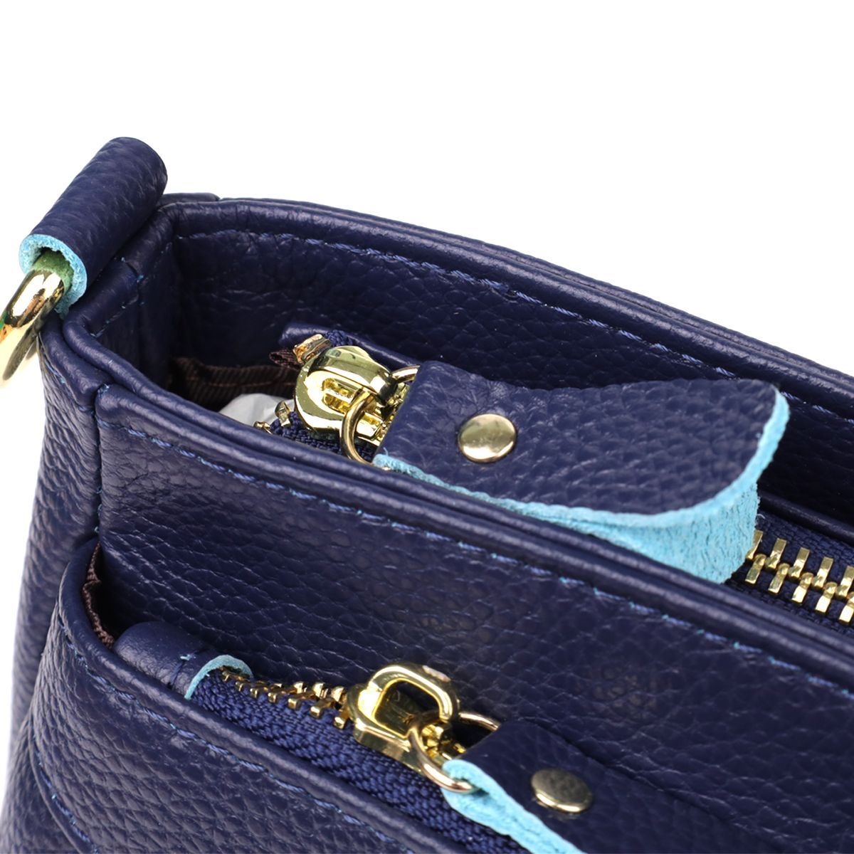 Ця синя шкіряна сумка з формостійким дном — чудовий вибір для сучасної жінки, яка цінує поєднання якості, дизайну та зручності.