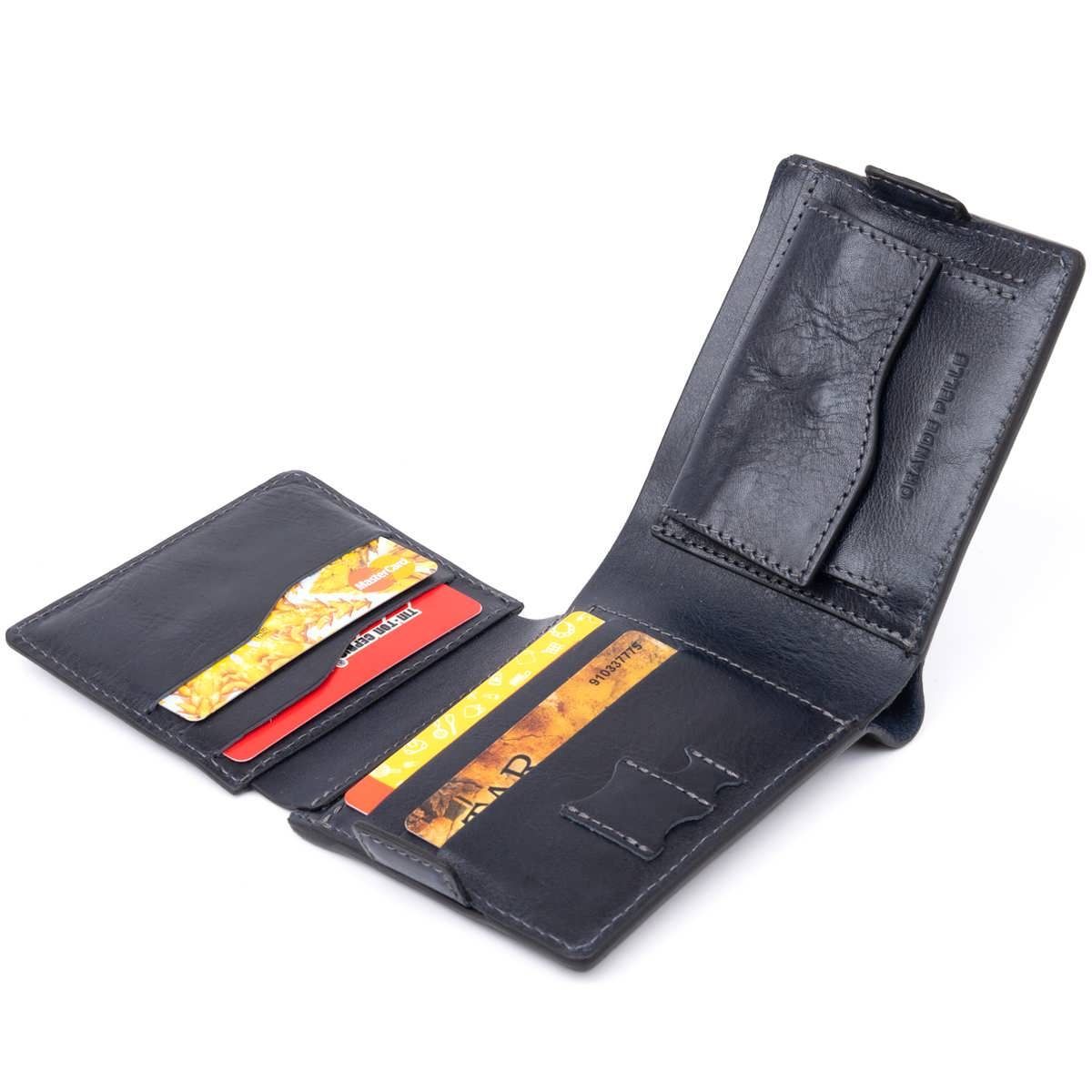 Містке та функціональне портмоне з натуральної шкіри блискучою. Аксесуар підійде для любителів функціональних аксесуарів, наближених до класичного. Оригінальний та модний синій колір виглядає дуже яскраво. Портмоне поміститься у маленьку сумку чи кишеню штанів. Доповнить та завершить ваш образ.