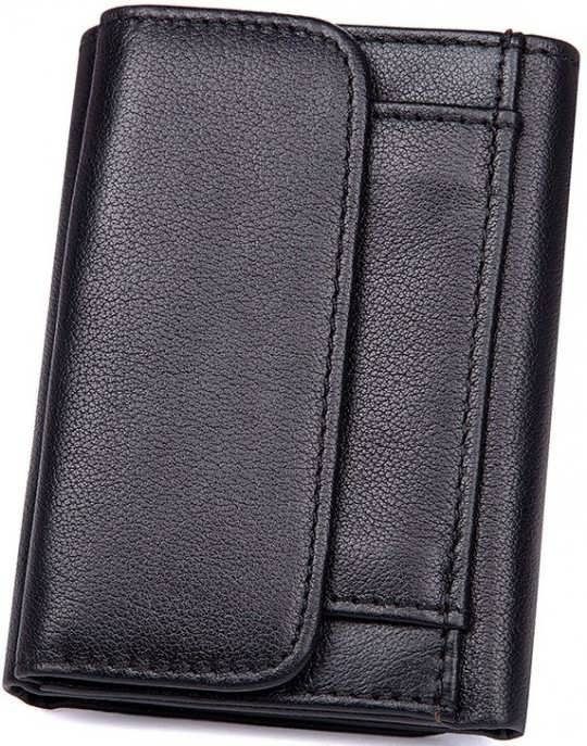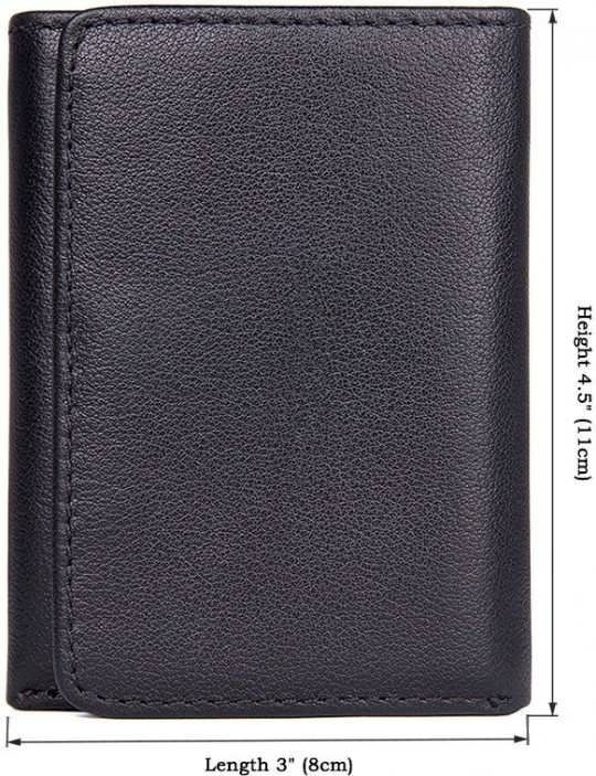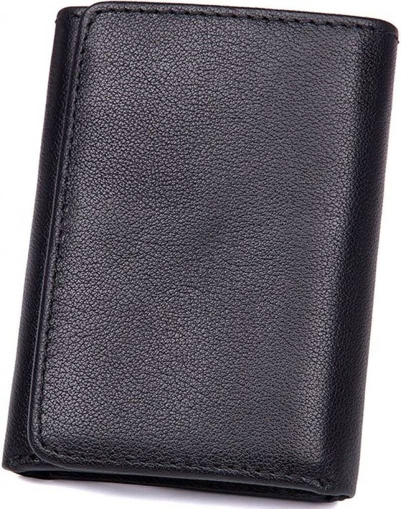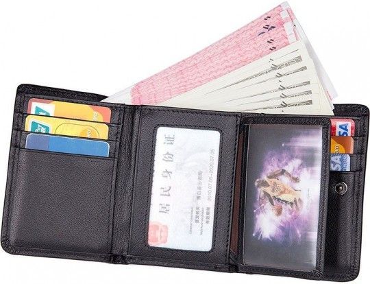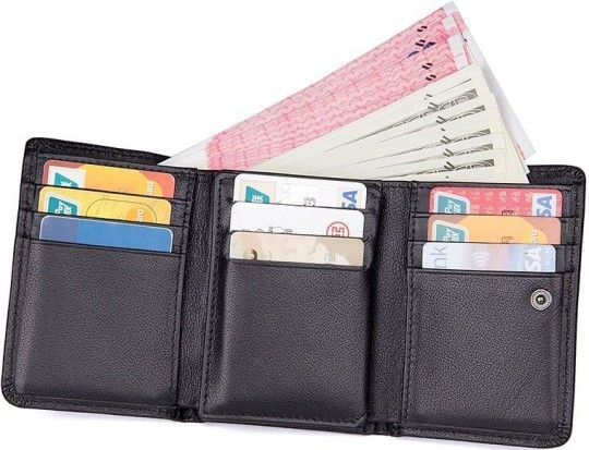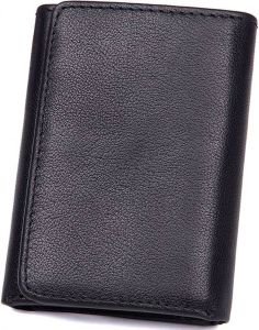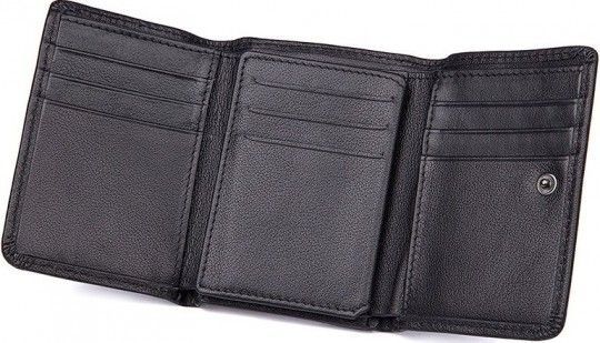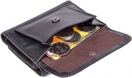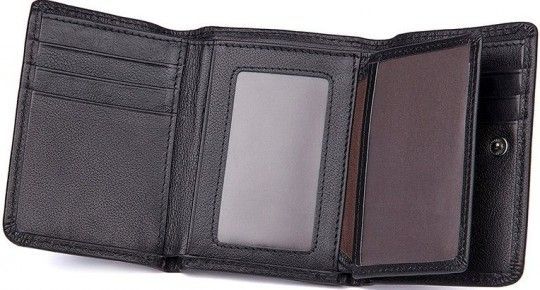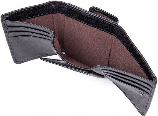Зручний чоловічий шкіряний гаманець Аксесуар міцно прошитий по діагоналі ниткою чорного кольору. Усередині гаманець має велику кишеню для купюр, які розміщуються у розгорнутому вигляді. Усередині гаманця є відділення для карток та прозора кишеня для документів. Сам аксесуар складається вдвічі та закривається на кнопку. На задній стороні аксесуара розташована монетниця, яка надає власнику гаманця швидкий доступ до дрібниці, не відкриваючи сам гаманець. Гаманець легко поміщається в кишеню будь-яких штанів і не займає багато місця в сумці або середніх розмірів борсетки. Гаманець упакований у текстильний чохол.
