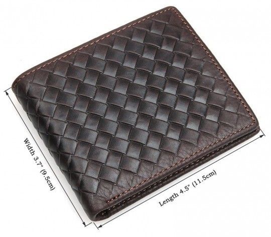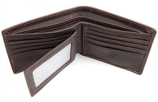 Зручне чоловіче портмоне із натуральної шкіри. Дана модель легко поміщається в передню або задню кишеню джинсів. Гаманець акуратно прошитий світло-коричневою ниткою. Зовнішній бік цієї моделі має декоративний, тісний малюнок. Гаманець упакований у текстильний чохол білого кольору.
