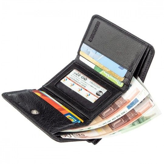 Жіночий гаманець з високоякісної шкіри у найпрактичнішому та універсальному чорному кольорі. Має стильний та красивий дизайн та відмінно підійде для прагматичних людей. Внутрішнє наповнення представлене місткими відділеннями для купюр, візитних та кредитних карток, а також для монет та інших дрібниць. Закривається на кнопки, причому монетниця та основне відділення автономно розмежовані. Гаманець абсолютно точно може використовуватися як аксесуар для жінок та чоловіків. Запакований гаманець у щільну картонну коробку білого кольору.