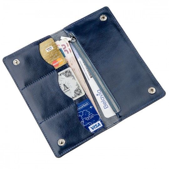 Солідний та м'який шкіряний гаманець стильного синього кольору. Аксесуар створений для людей, які цінують стиль та комфорт. Виріб прошито по краях рівним рядком. Доповнює аксесуар тиснений логотип бренду на лицьовій стороні аксесуара. Виріб закривається на дві кнопки зверху та знизу. Такий гаманець стане чудовим помічником для свого власника.