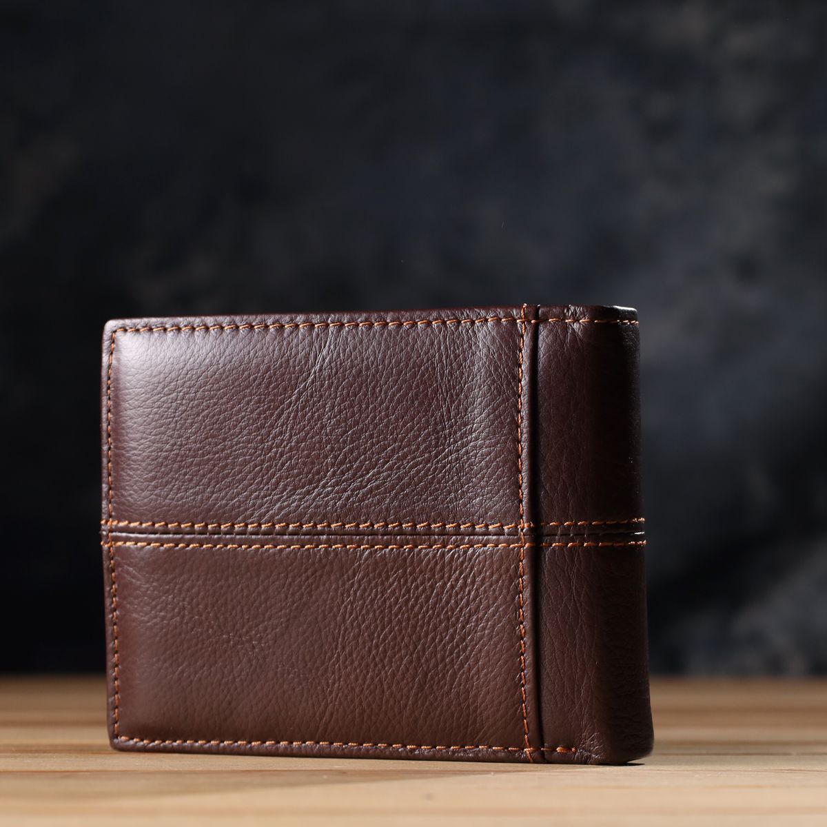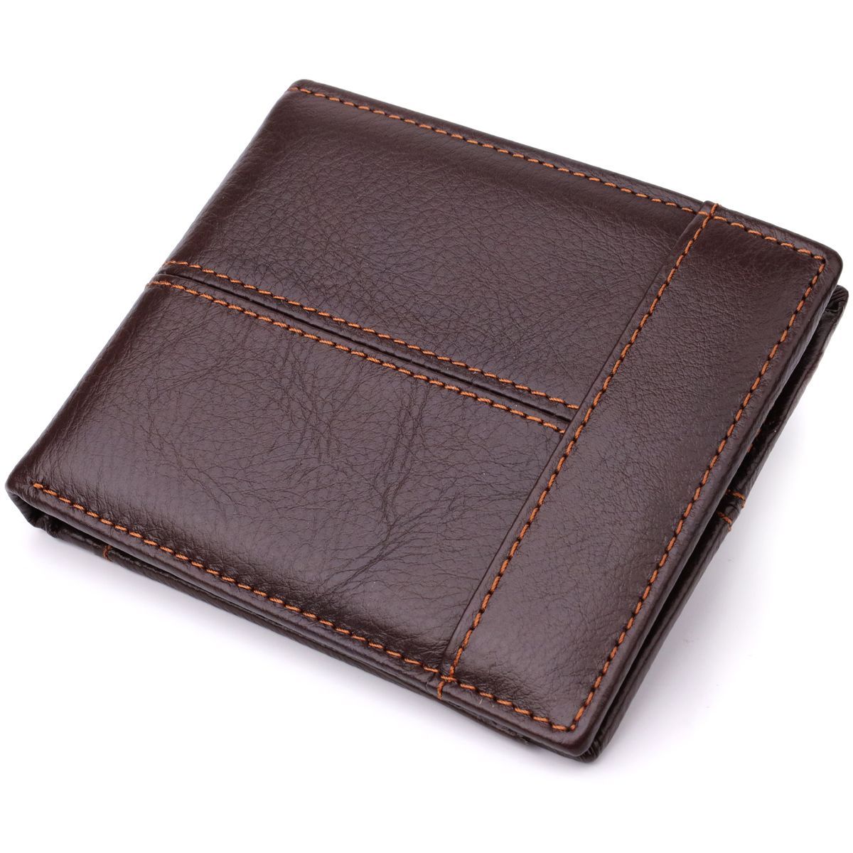 Якісний чоловічий гаманець, виготовлений з натуральної шкіри преміальної якості. Аксесуар акуратно прошитий надміцною коричневою ниткою, що надає виробу додаткову міцність і підкреслює його елегантний зовнішній вигляд. Гаманець приємний на дотик, з продуманою до дрібниць внутрішньою організацією. Компактний та зручний, він легко поміщається в кишеню чи сумку, забезпечуючи швидкий доступ до всіх необхідних речей. Модель складається навпіл і не має застібки, що робить використання ще більш зручним та практичним. Всередині гармонійно поєднуються елементи з натуральної шкіри та щільного текстилю, що збільшує термін служби аксесуара. Гаманець поставляється в білому текстильному чохлі, що робить його відмінним варіантом для подарунка.
