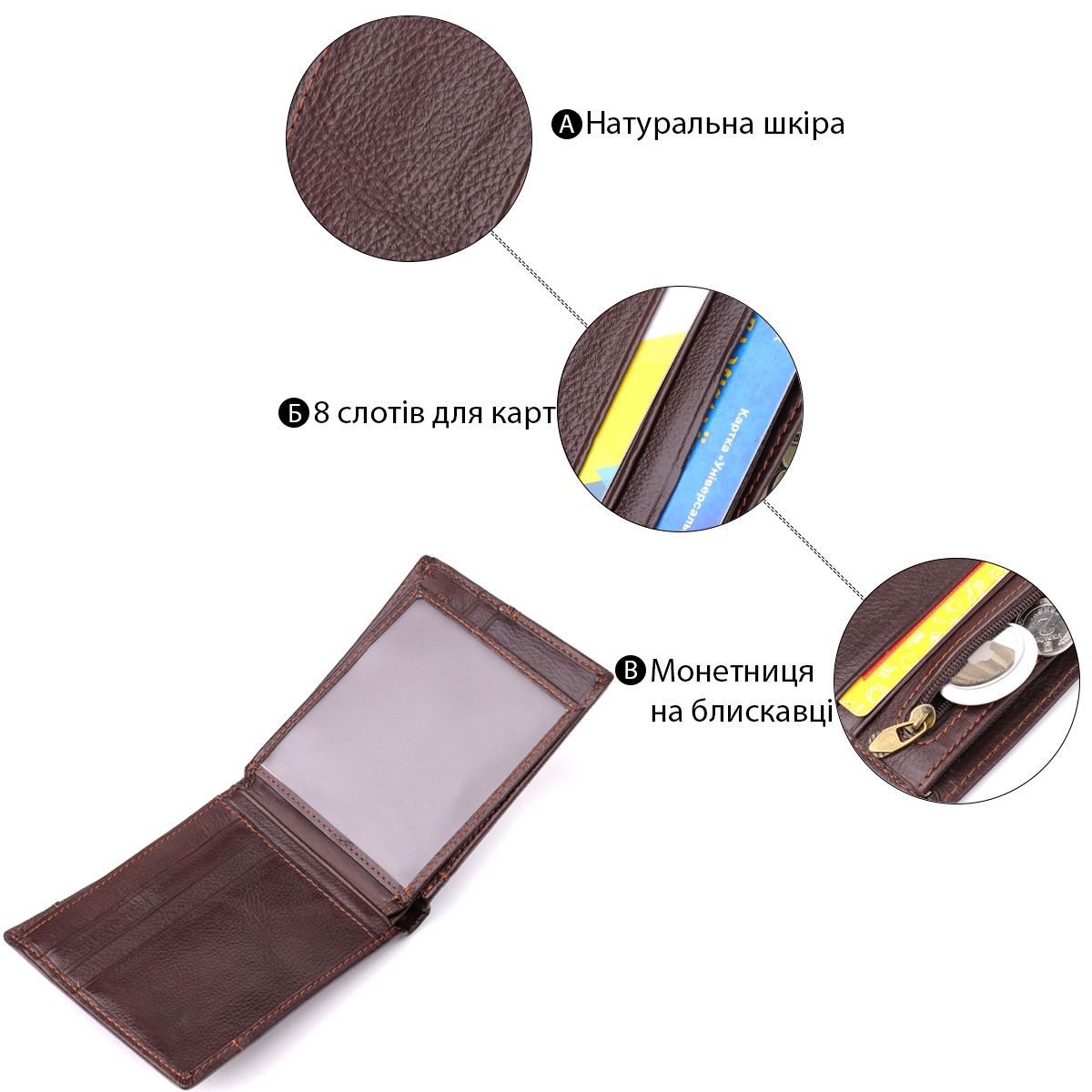 - 3 відділення для банкнот (одне з них на блискавці);