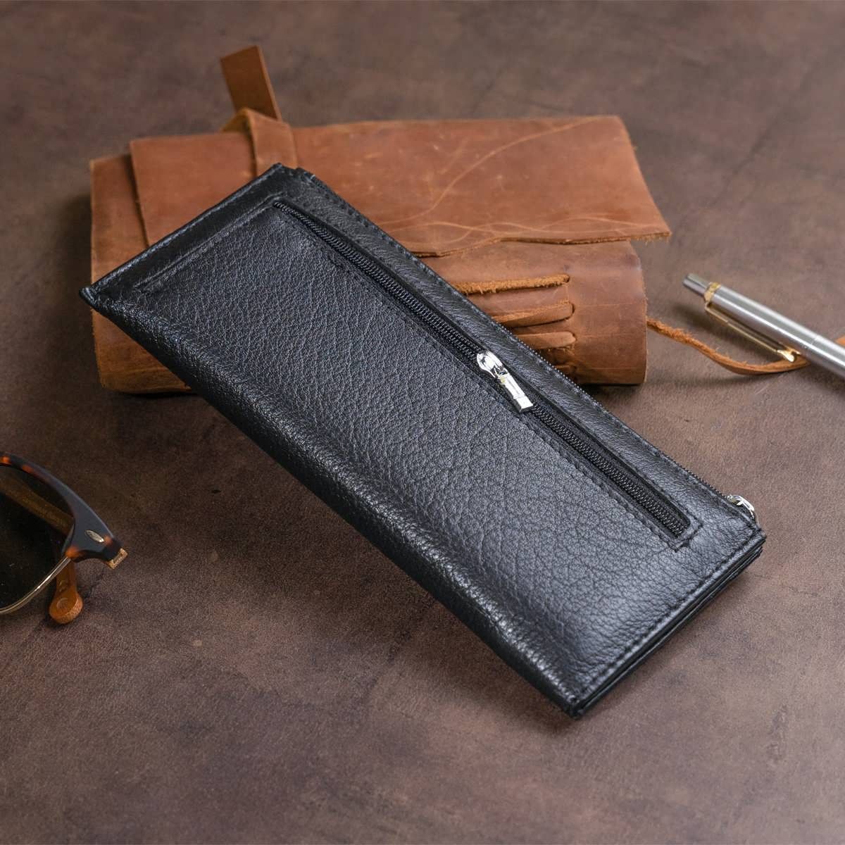 Нове надходження. Модель у чорному кольорі. Гаманець із натуральної шкіри китайського виробництва. Аксесуар підійде як чоловіка, так жінки. У виріб поміщаються купюри у розгорнутому вигляді. У гаманець можна скласти достатню кількість кредиток. Розмір гаманця дуже компактний і займає багато місця. Закривається виріб на блискавку. Приємний на дотик аксесуар із легким запахом натуральної шкіри. У комплекті до гаманця йде фірмова картонна коробка.