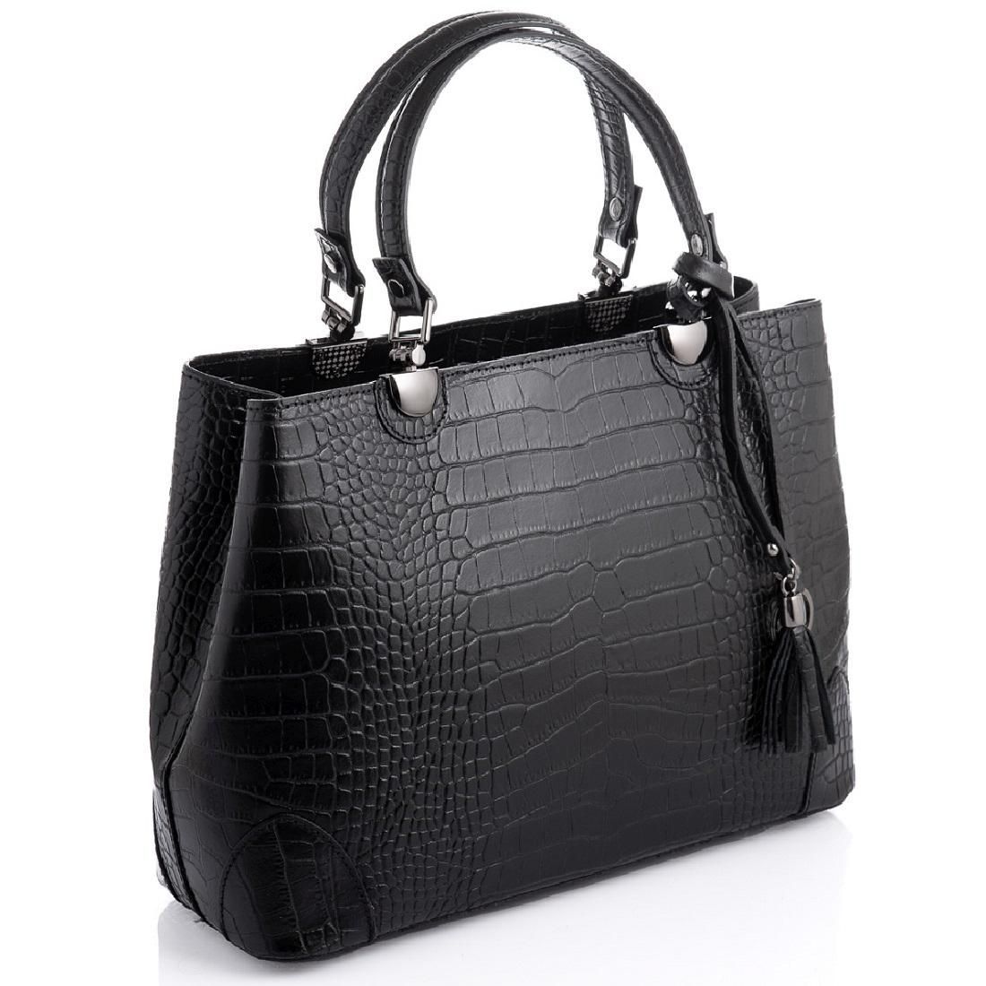 Сумка італійського виробника Firenze Italy F-IT-7603A, класичної форми. Шкіра глянцева з якісним тисненням під рептилію. Розміри: 32 x 23 x 12см. Сумка має один основний відділ та додаткове відділення-перегородку на блискавці всередині. Також усередині є бічна кишенька на блискавці. У комплекті з цією моделю є довгий шкіряний ремінець, який можна використовувати, коли сумку незручно нести в руках. Сумка має прикрасу у вигляді пензлика зі шкіри, за бажання його можна зняти. Підкладка – текстиль. Колір чорний. Колір фурнітури: темне срібло.