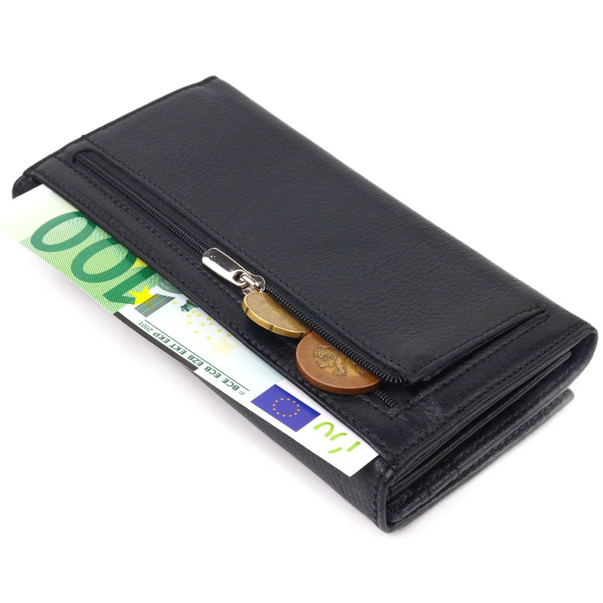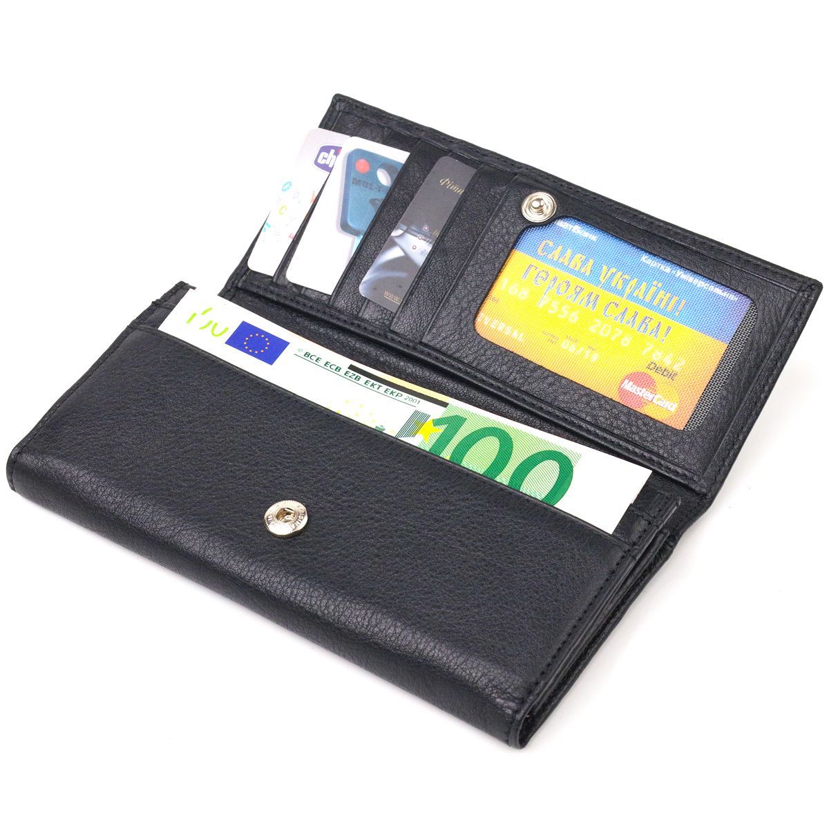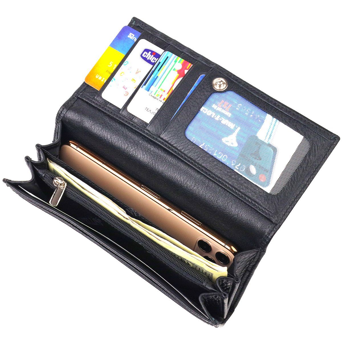- три широкі відділення для купюр, з двома перегородками, одна перегородка закривається на блискавку;