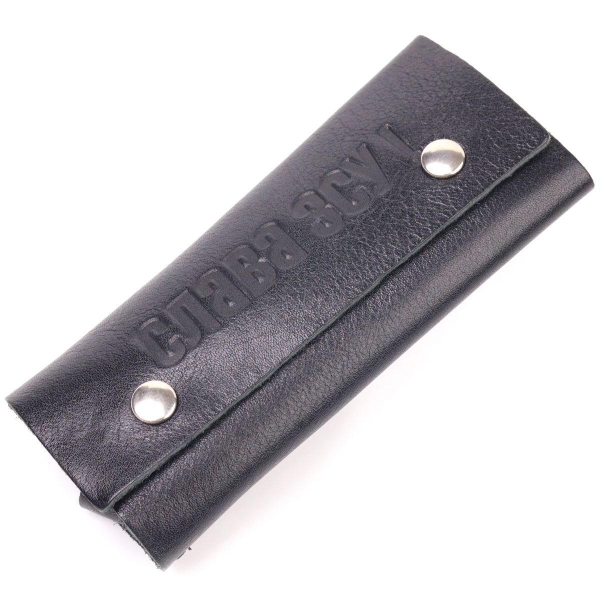 Патріотична шкіряна ключниця на кнопках, з тисненням на лицьовій стороні "Слава ЗСУ". Виріб пошитий з гладкої шкіри, з високими показниками зносостійкості. В аксесуарі використана надійна фурнітура, кольору срібла. Вироби зі шкіри завжди вважалися відмінним подарунком, незалежно від статі та віку.