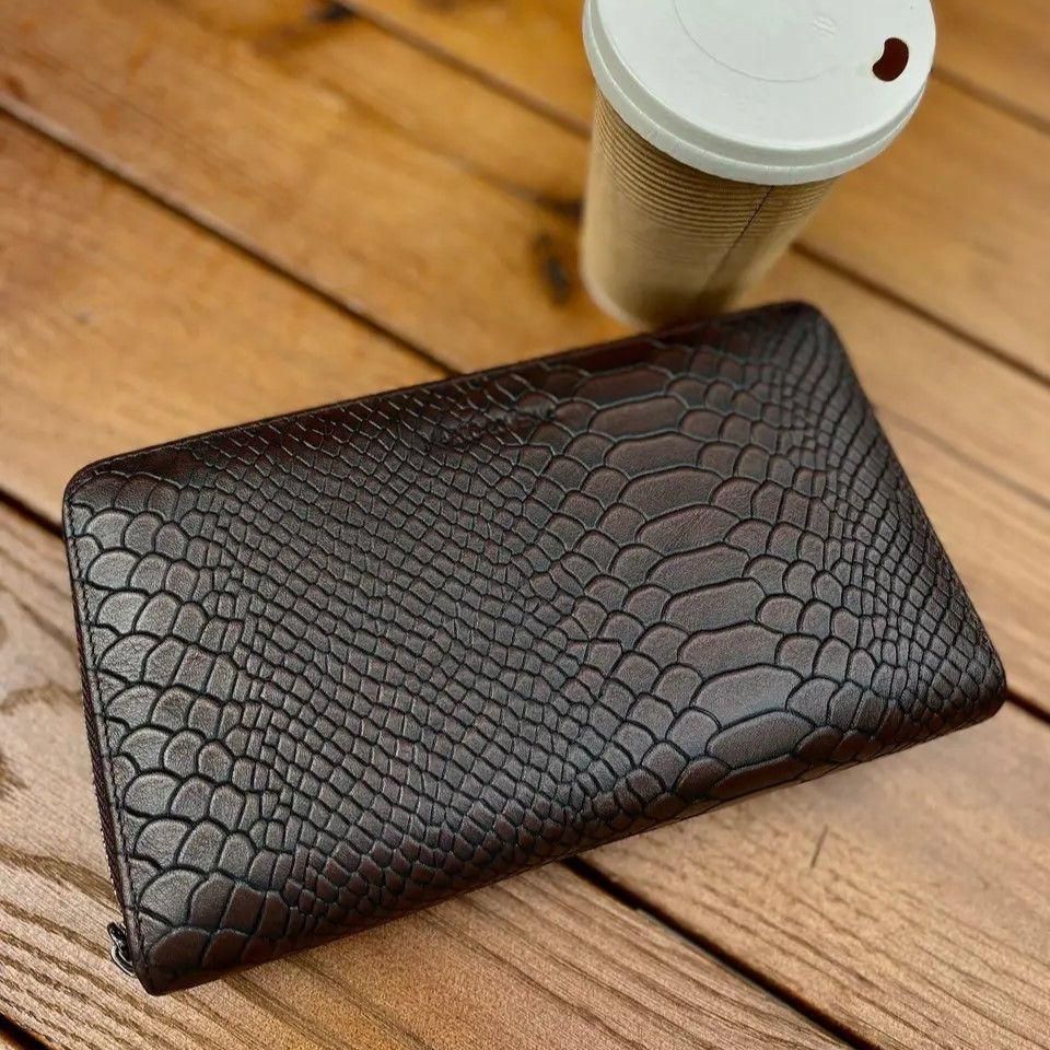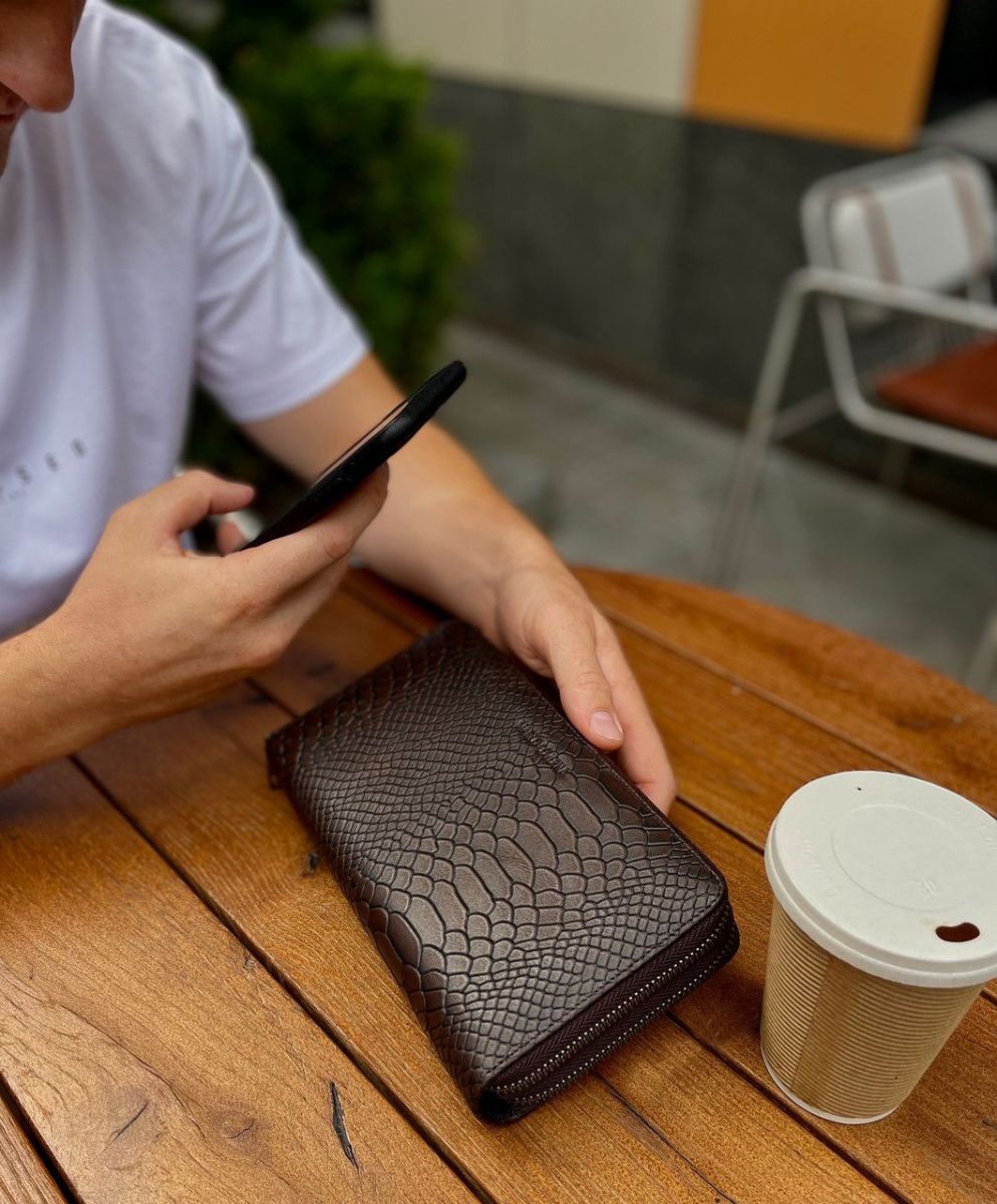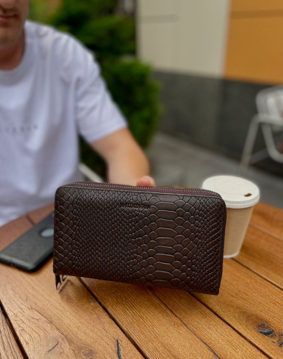 Чоловічий гаманець по типу клатча не тільки стильний але і практичний. У ньому є все необхідне: відділення для купюр, кишеня-перегородка на блискавці для монет та блок під картки. 2 прилеглі до стінки кишені підходять для банкнот або паперів. Відкритий доступ до 24 карток. До того ж у ньому є петля для носіння ручки. На особливу увагу заслуговує стиль шкіряного чоловічого гаманця: тиснення під шкіру змії вдало поєднується з металевою блискавкою. Аксесуар можна носити як клатч: для цього передбачено 2 ремені: на зап'ястя та долоню.