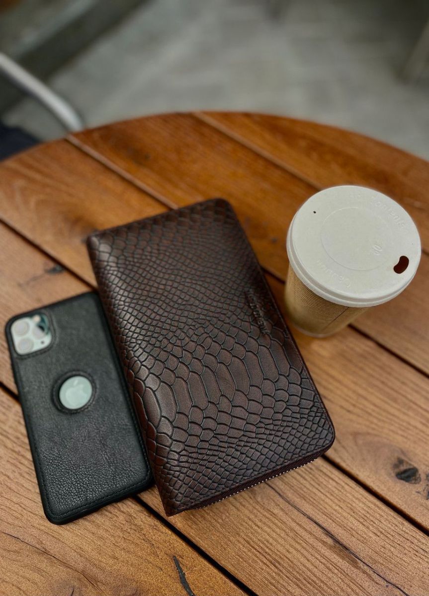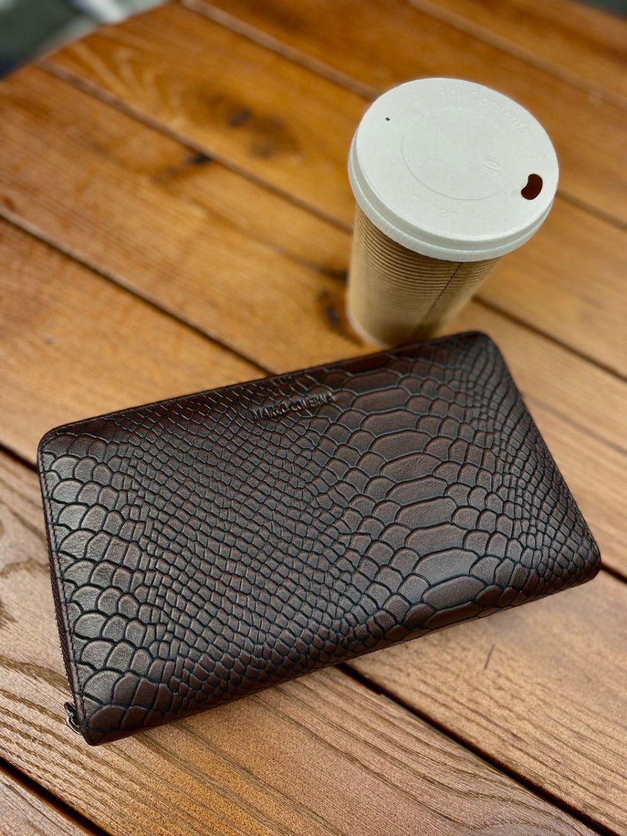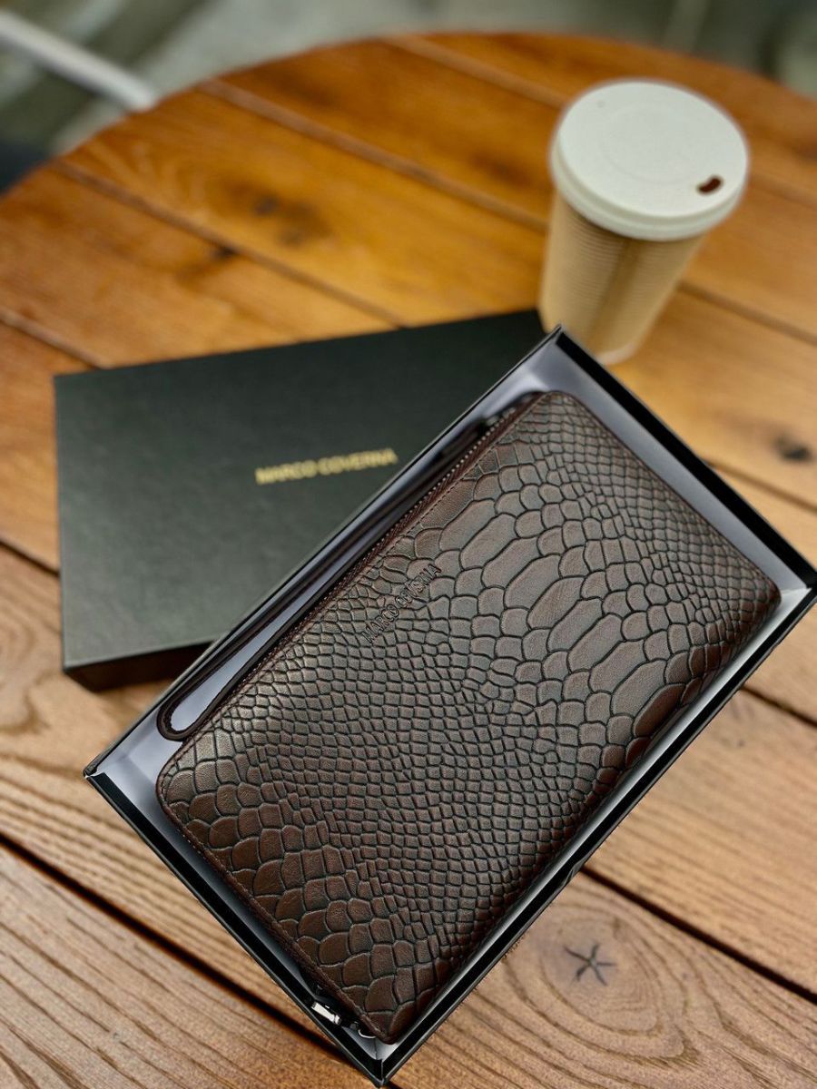Чоловічий гаманець по типу клатча не тільки стильний але і практичний. У ньому є все необхідне: відділення для купюр, кишеня-перегородка на блискавці для монет та блок під картки. 2 прилеглі до стінки кишені підходять для банкнот або паперів. Відкритий доступ до 24 карток. До того ж у ньому є петля для носіння ручки. На особливу увагу заслуговує стиль шкіряного чоловічого гаманця: тиснення під шкіру змії вдало поєднується з металевою блискавкою. Аксесуар можна носити як клатч: для цього передбачено 2 ремені: на зап'ястя та долоню.