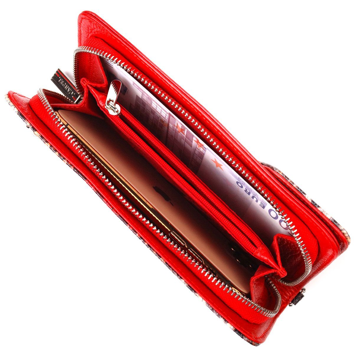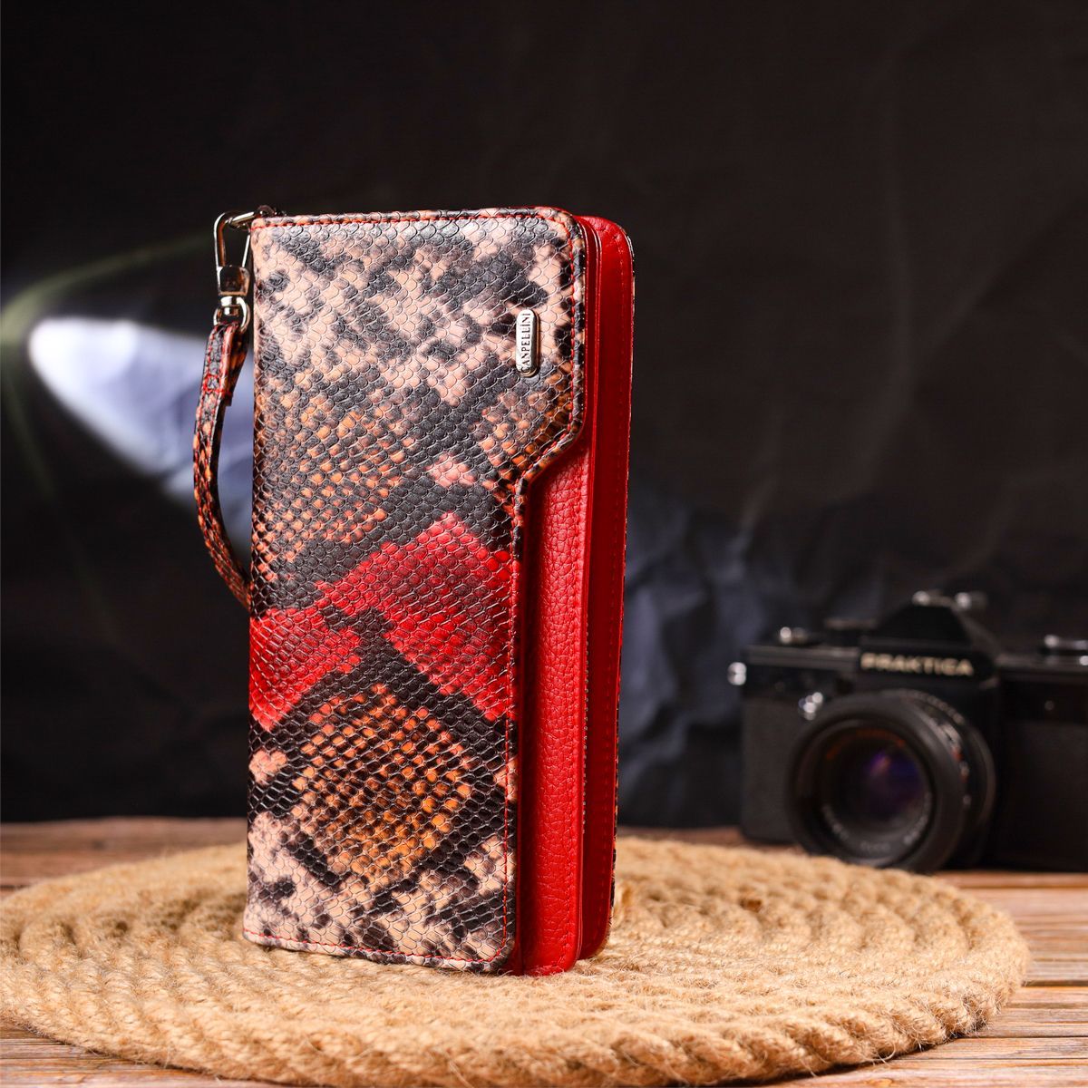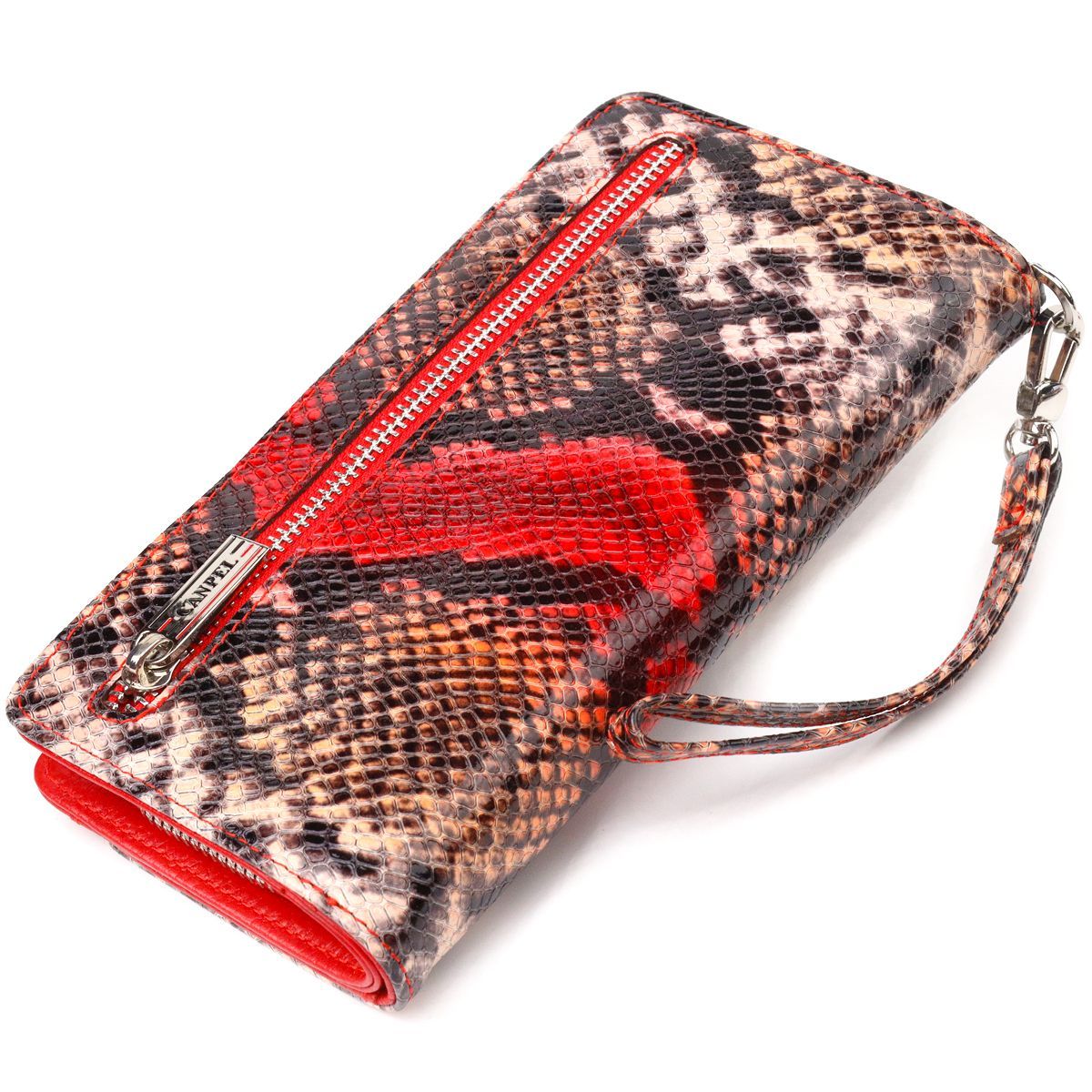 Яскравий жіночий гаманець - клатч, з натуральної фактурної шкіри з тисненням під змію – зовні, і з натуральної шкіри флотар – всередині. Аксесуар має одне основне відділення, в яке поміщаються купюри всіх номіналів, дванадцять кишень для карток, один з яких під сіточкою, блок для карт із зовнішнього боку, дві кишеньки на блискавці, знімний кистьовий ремінь. Закривається аксесуар на блискавку, а блок для карток закривається на кнопки. Колір фурнітури – срібло. Шкіряний гаманець є дивовижним подарунком для дружини, колеги, подруги.