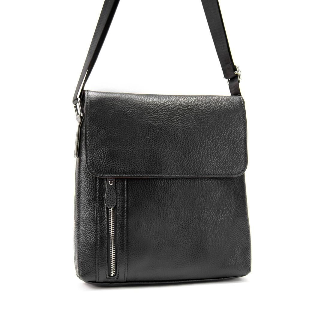 Чоловіча шкіряна сумка Tiding Bag M56-17195A виготовлена з натуральної шкіри чорного кольору та має зернисту структуру. Особливості: має одне основне відділення, що закривається на блискавку з клапаном на магнітній кнопці. Розміри сумки становлять 27 x 5 x 24 см. Із задньої та тильної частини аксесуар має кишеню розміром 15х12 см, яка закривається на блискавку. Месенджер має м'яку структуру. Підкладка - текстиль. Плечовий ремінь регулюється за довжиною, в діапазоні 70-140 см. Колір: чорний. Колір фурнітури: срібло.