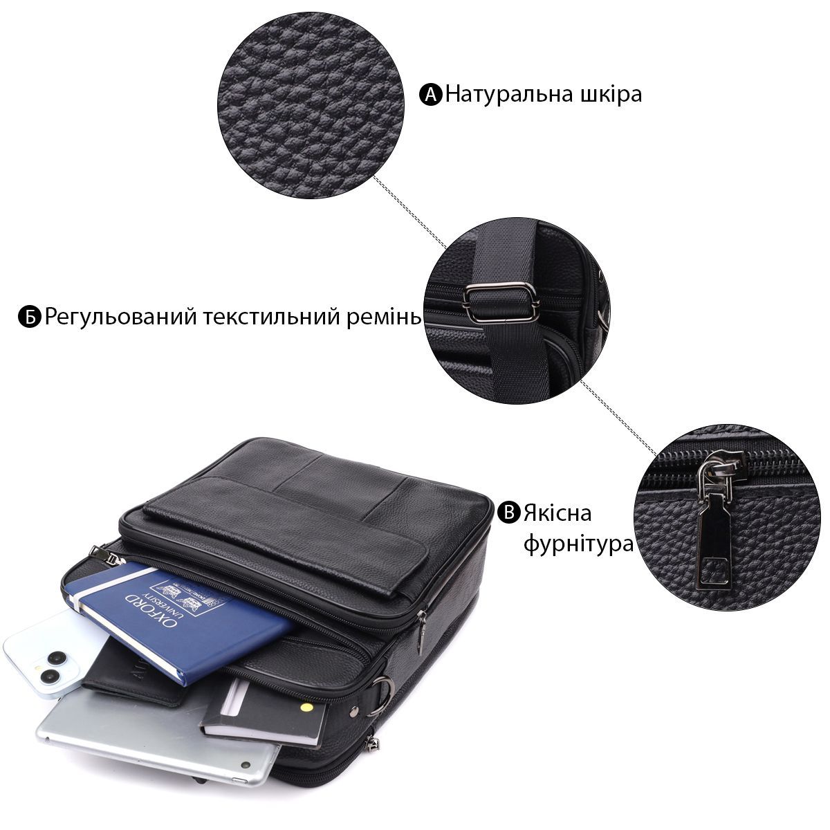 Ця шкіряна сумка – відмінний вибір для тих, хто шукає поєднання практичності, якості та елегантності в одному аксесуарі.