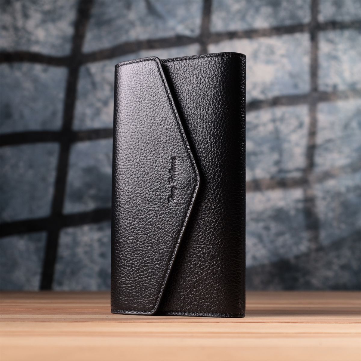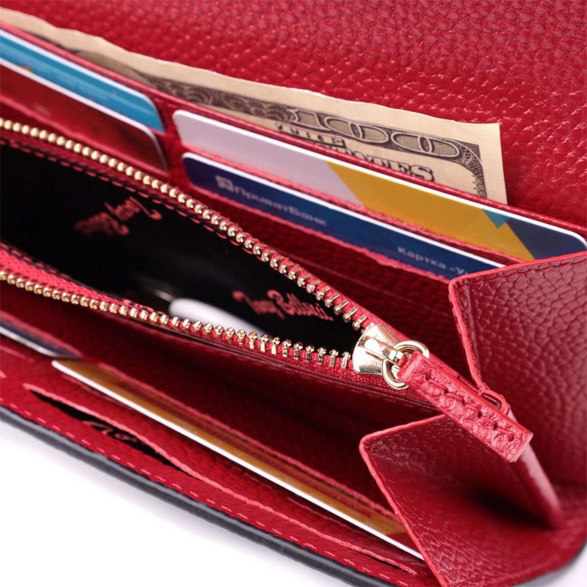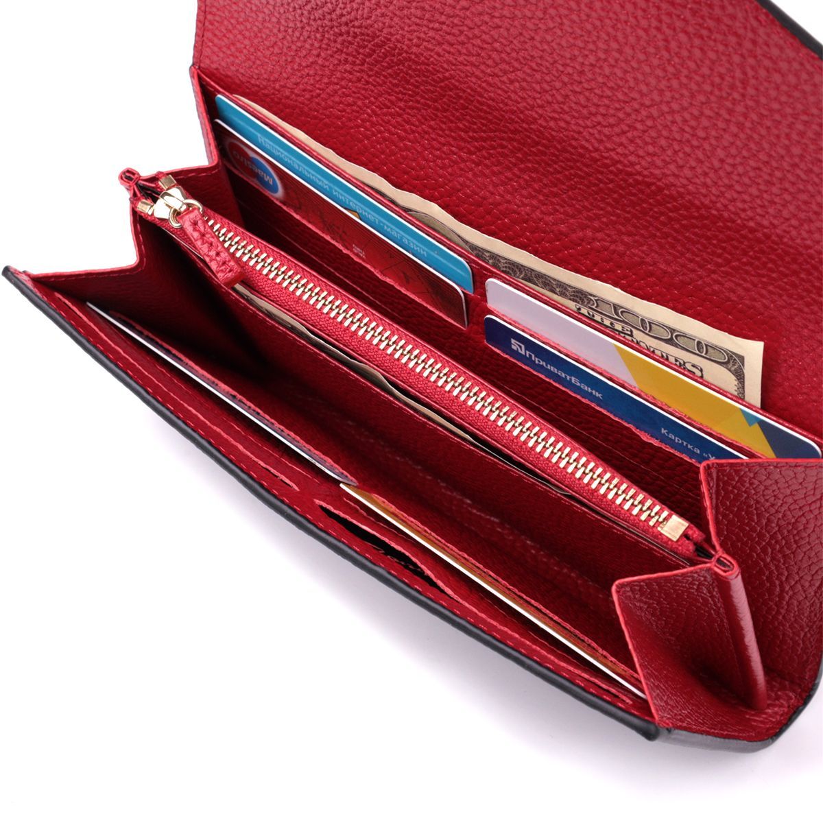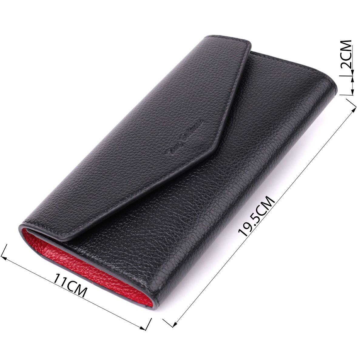 Місткий гаманець для жінок з натуральної шкіри, у комбінації з двох кольорів чорного зовні та червоного всередині. Аксесуар складається з двох широких відділень для купюр, дванадцяти осередків для пластикових карток, двох прилеглих кишень та монетниці на блискавці. У виробі використано якісну фурнітуру золотистого кольору. Закривається гаманець трикутним клапаном на кнопку. Аксесуар упакований у фірмову коробочку. Вироби з натуральної шкіри завжди будуть чудовим подарунком для близької людини.