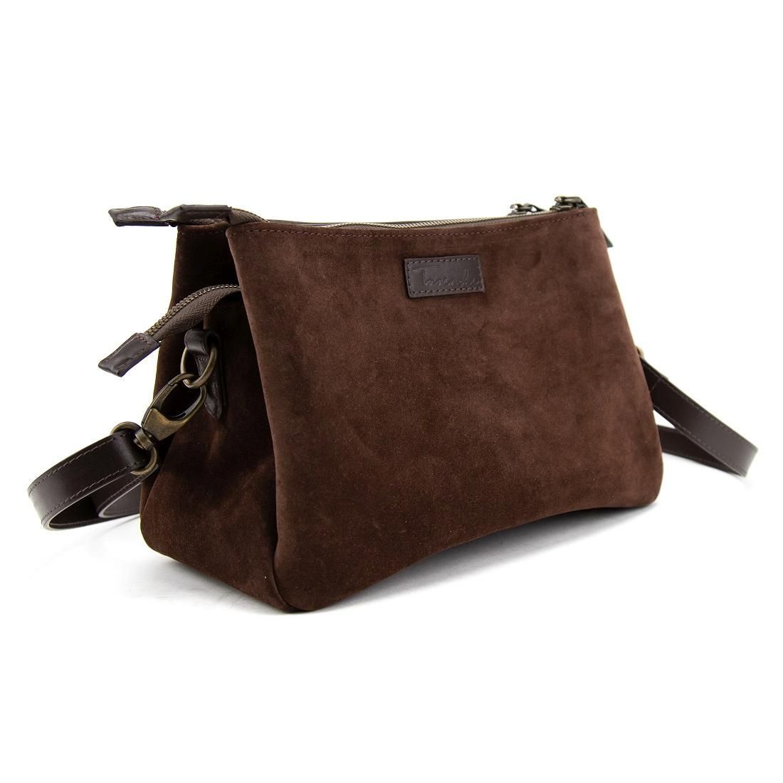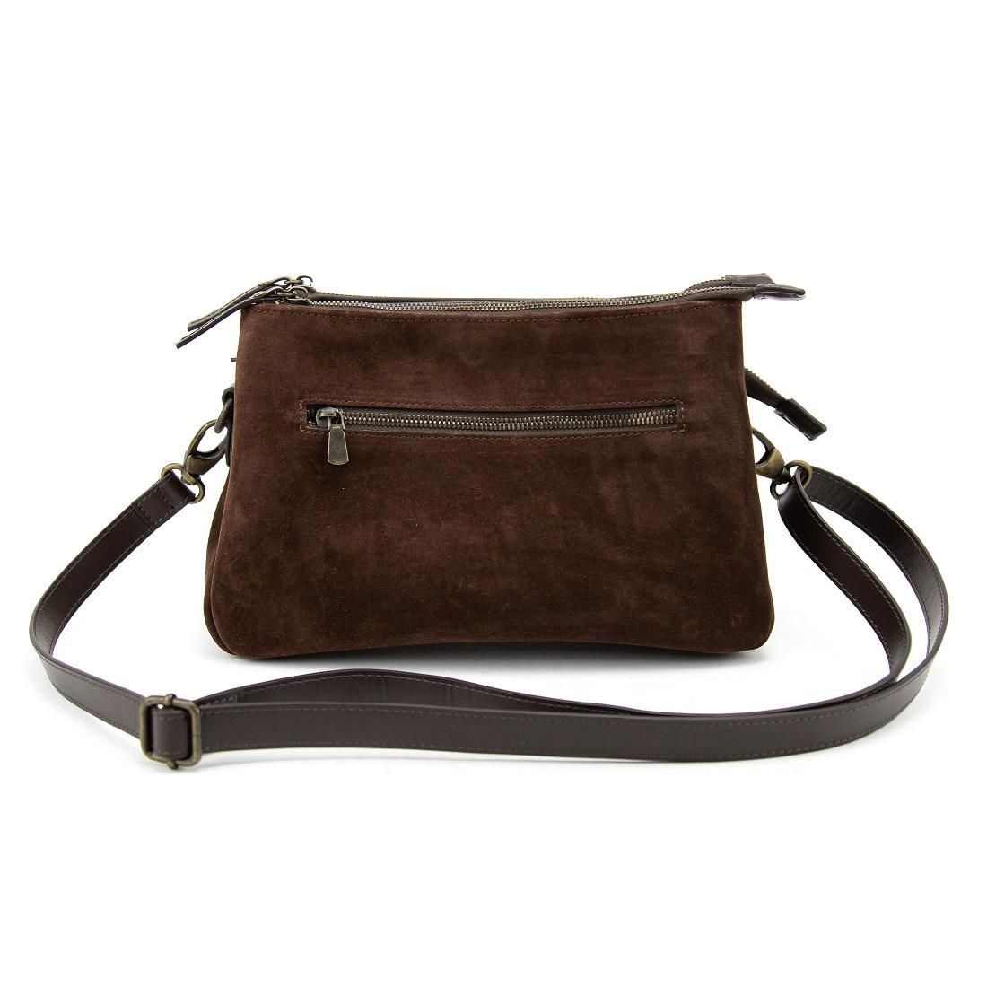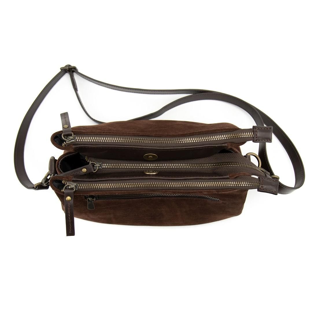 Елегантна жіноча сумка кросбоді з натуральної замші — поєднання витонченого дизайну та практичності на кожен день. Компактна модель розміром 27×24×11,5 см має три окремі відділи на блискавках, де зручно розмістити всі необхідні речі. Усередині — текстильна підкладка та кишеньки на змійці для дрібних предметів.