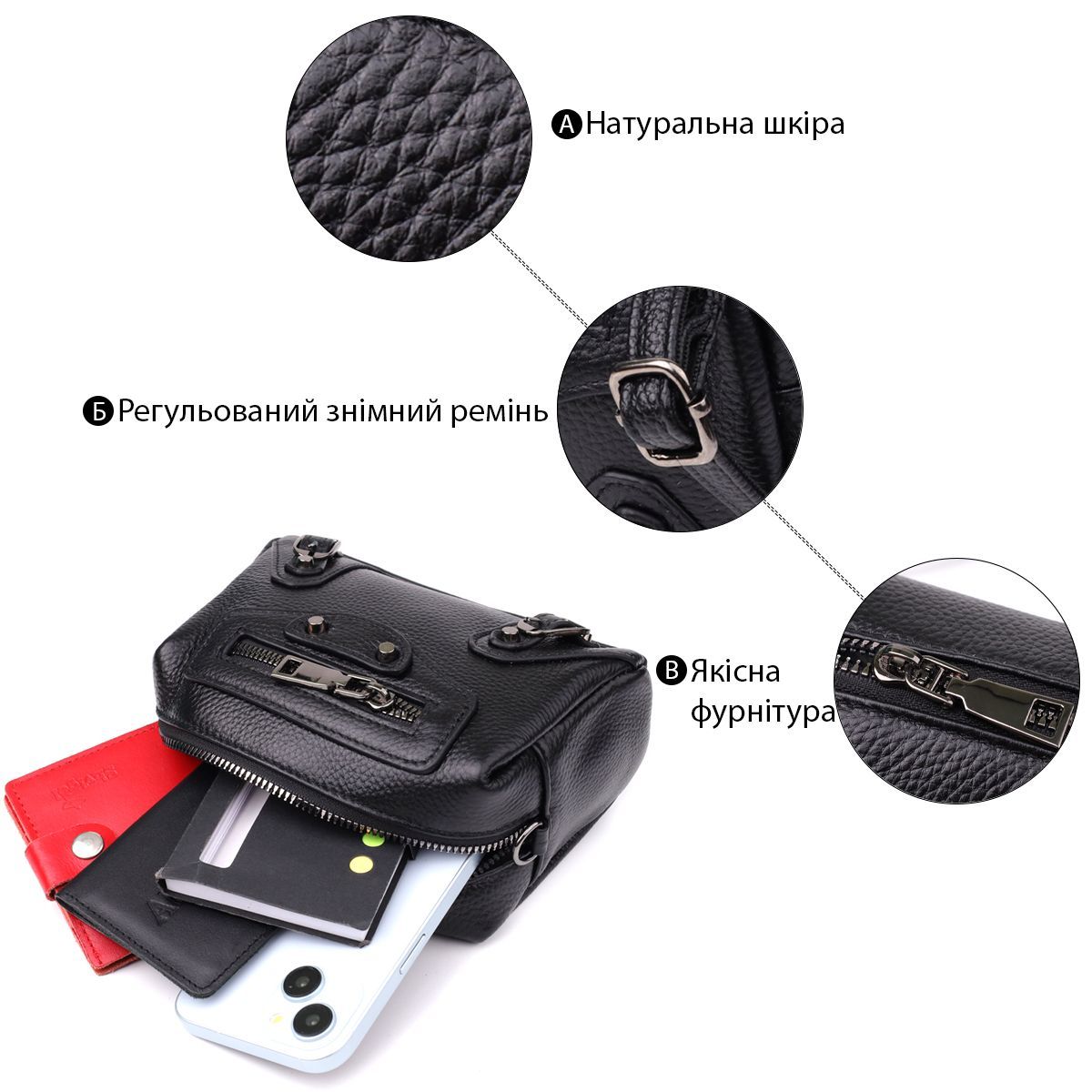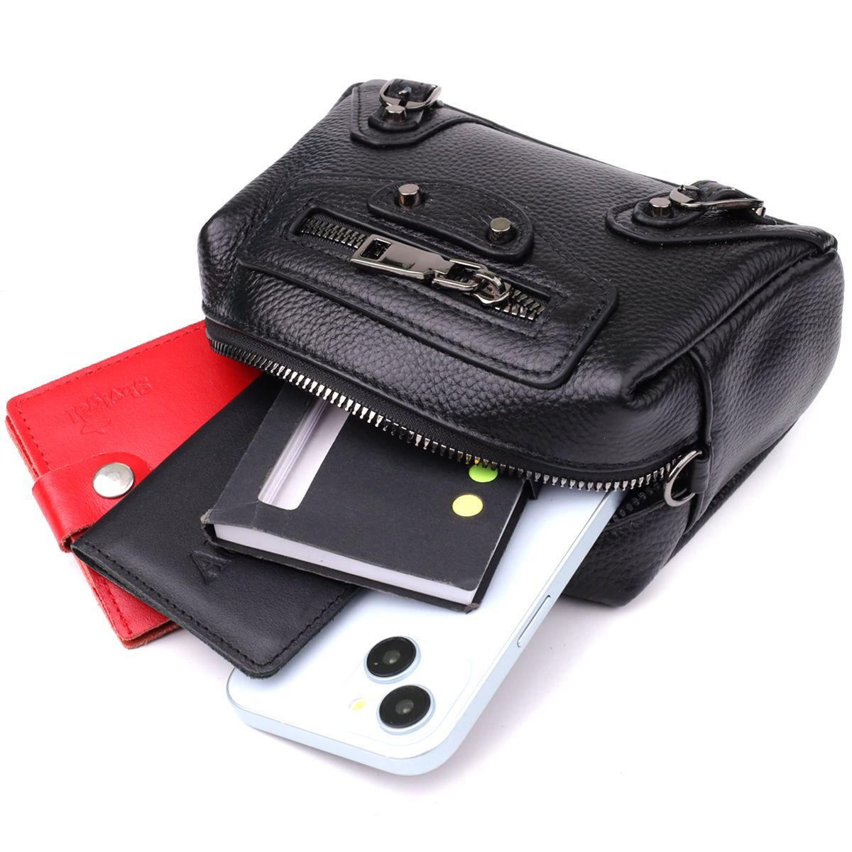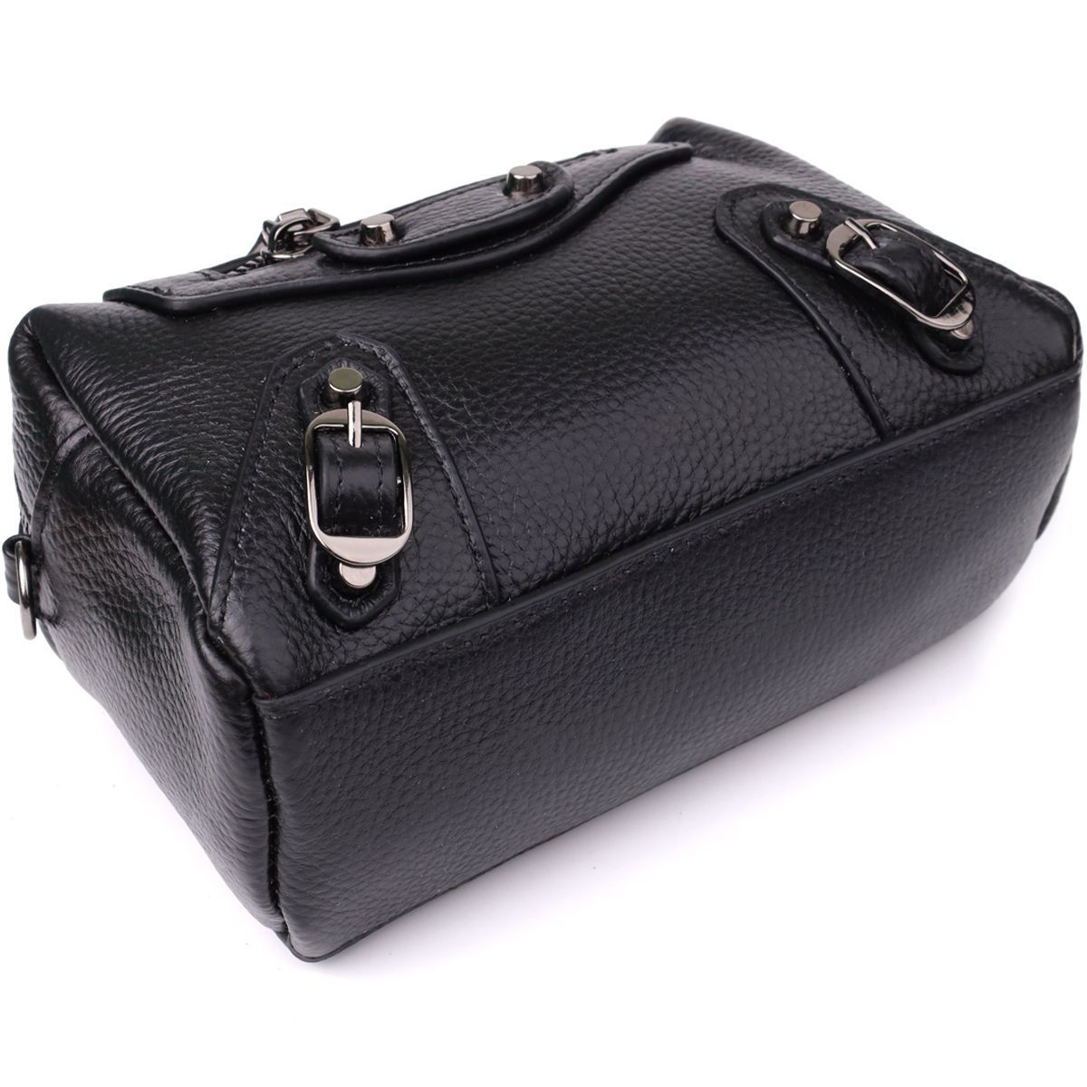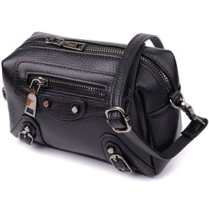 Невелика шкіряна жіноча сумка з декоративними елементами — стильна деталь для сміливого образу. Ця компактна модель відразу привертає увагу рахунок ефектного дизайну: чорна натуральна шкіра доповнена виразними металевими елементами, декоративним рядком і акцентною фурнітурою. Стильна зовнішня кишеня на блискавці обрамлена заклепками та декоративними ремінцями, надаючи аксесуару легку брутальність та характер.