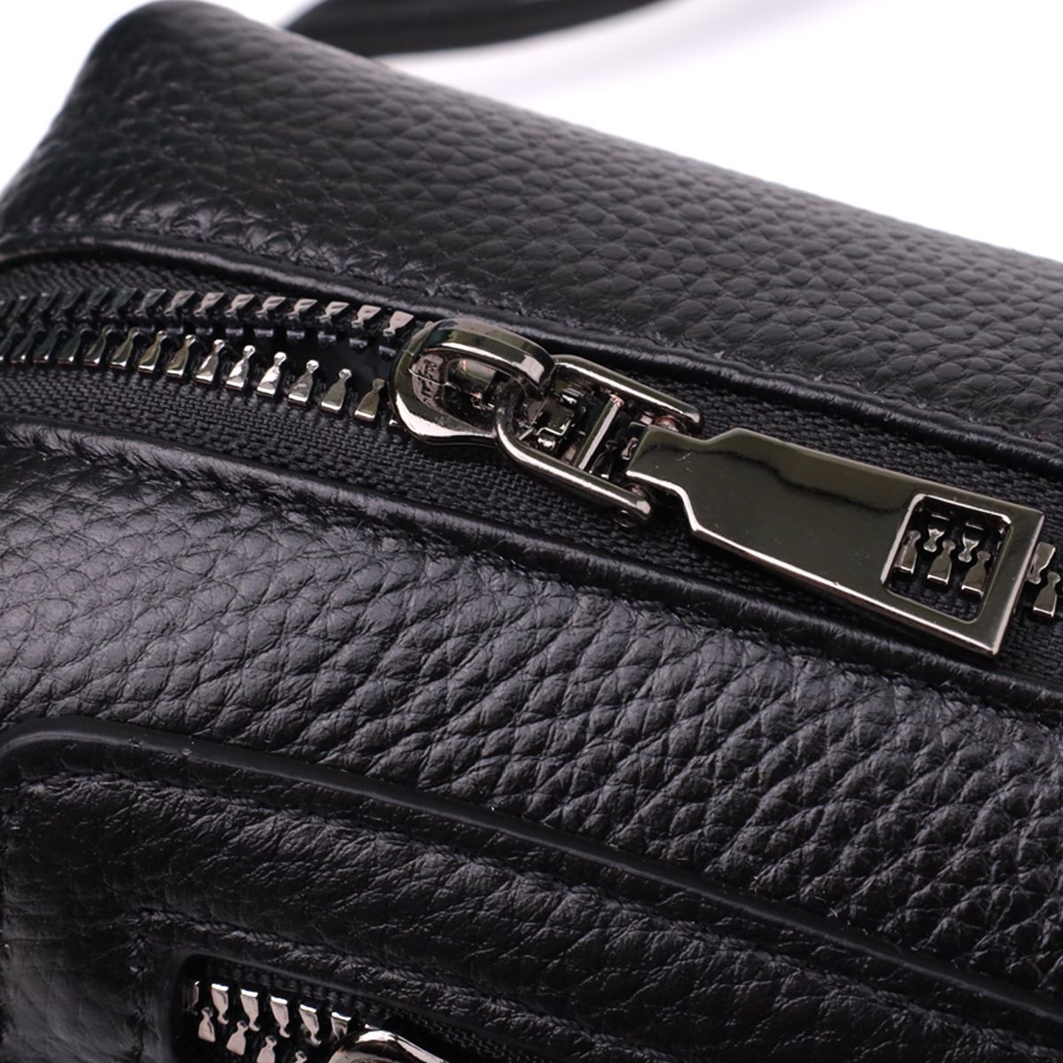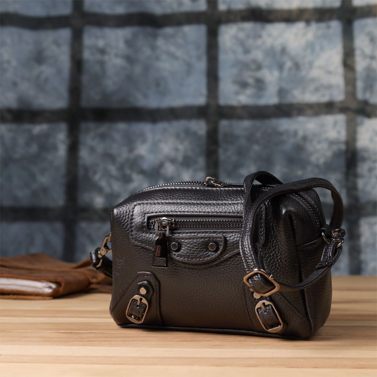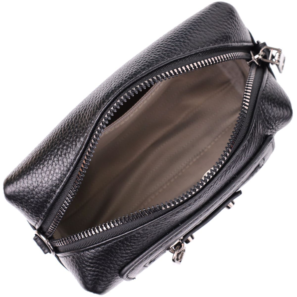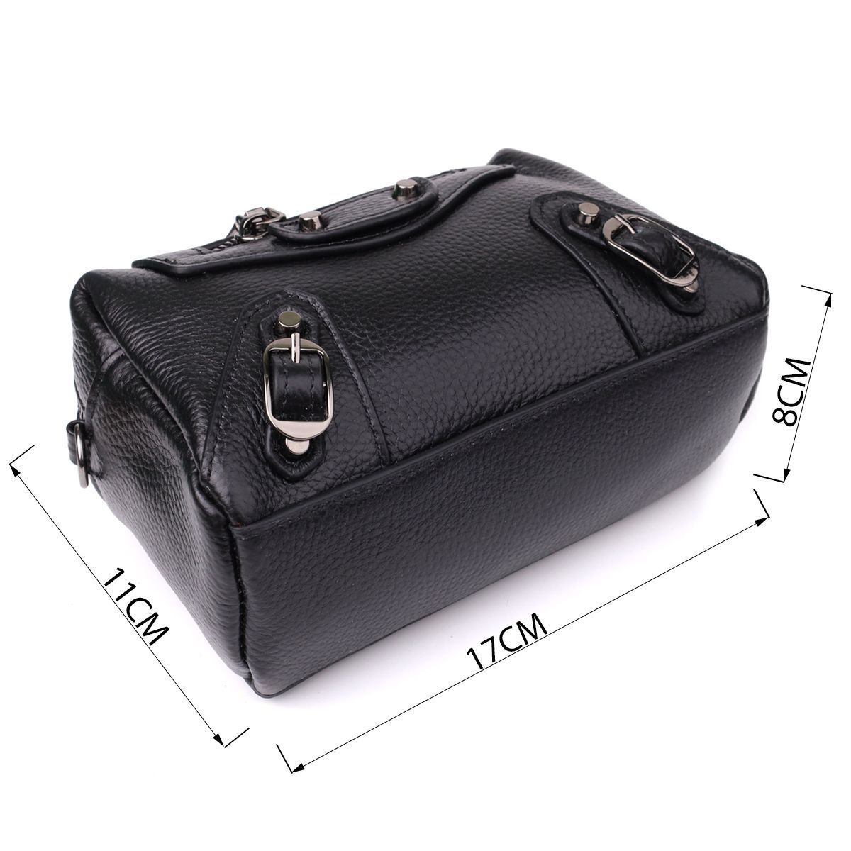 Невелика шкіряна жіноча сумка з декоративними елементами — стильна деталь для сміливого образу. Ця компактна модель відразу привертає увагу рахунок ефектного дизайну: чорна натуральна шкіра доповнена виразними металевими елементами, декоративним рядком і акцентною фурнітурою. Стильна зовнішня кишеня на блискавці обрамлена заклепками та декоративними ремінцями, надаючи аксесуару легку брутальність та характер.
