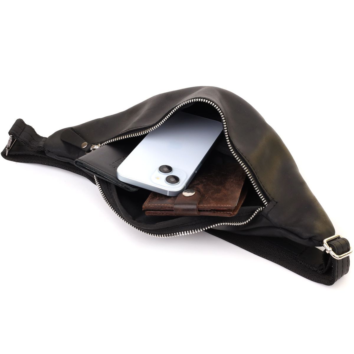 Незважаючи на компактність, бананка містка та зручна: основне відділення на блискавці та додаткова кишеня забезпечують порядок та швидкий доступ до необхідних речей. Регульований ремінь зі шкіри та текстилю дозволяє носити сумку так, як вам зручно – на поясі або через груди.