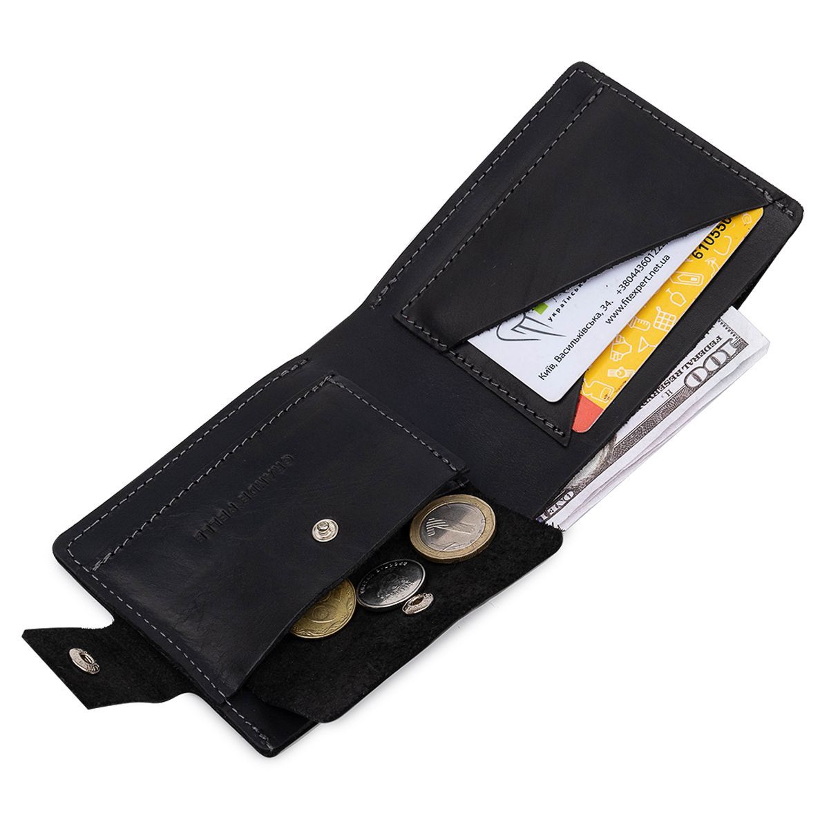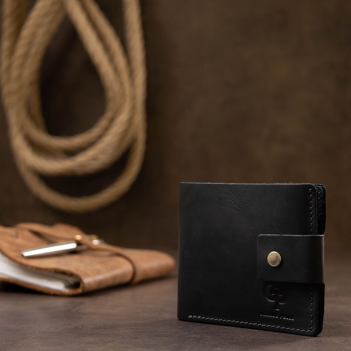 Невелике чоловіче портмоне високої якості виконання та матеріалів. Легко поміщається у сумці будь-якого розміру чи кишені. Закривається виріб на зручний хлястик із кнопкою. Усередині є містке відділення для купюр, два слоти для карток та монетниця на кнопці. Запаковано виріб у фірмовий чохол.
