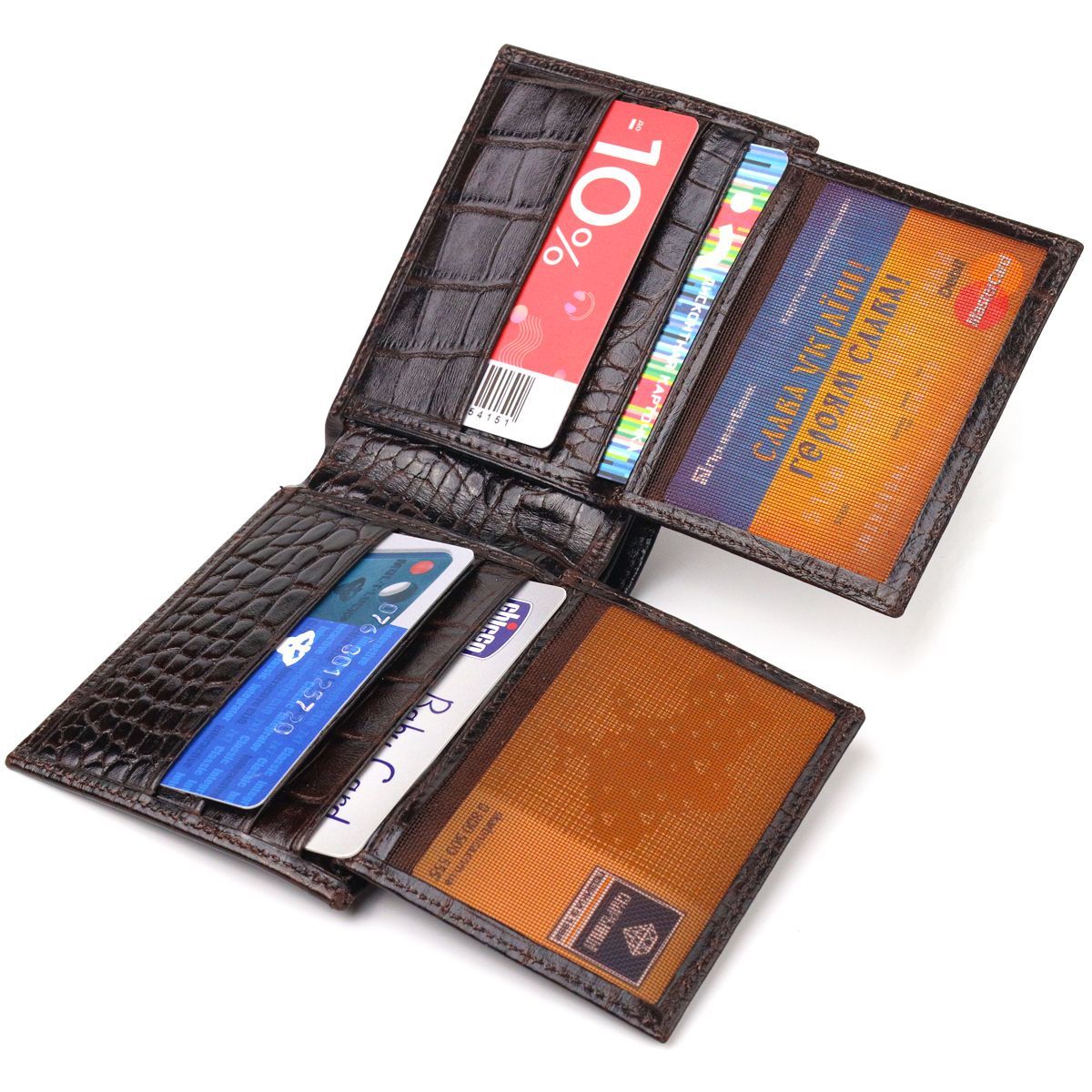 Компактний чоловічий гаманець, з натуральної фактурної шкіри, з тисненням під крокодила. Аксесуар має одне основне відділення з перегородкою, в якому розміщуються купюри всіх номіналів, дванадцять кишень для карток, чотири з яких під сіточкою. Ви легко зможете помістити його в кишеню штанів чи маленьку сумку. Запакований гаманець картонну коробку. Шкіряний гаманець є чудовим подарунком для рідних та близьких людей.