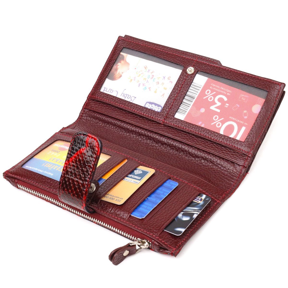 Жіночий місткий гаманець з натуральної фактурної шкіри з тисненням під змію. Аксесуар має шість прилеглих кишень, у які помістяться купюри всіх номіналів, містку монетницю та двадцять кишень для карток. Закривається аксесуар хлястиком на кнопку. Якщо Ви хочете порадувати себе та здивувати близьких, то неодмінно купуйте шкіряні аксесуари в нашому магазині, якість і ціна Вас однозначно порадує.