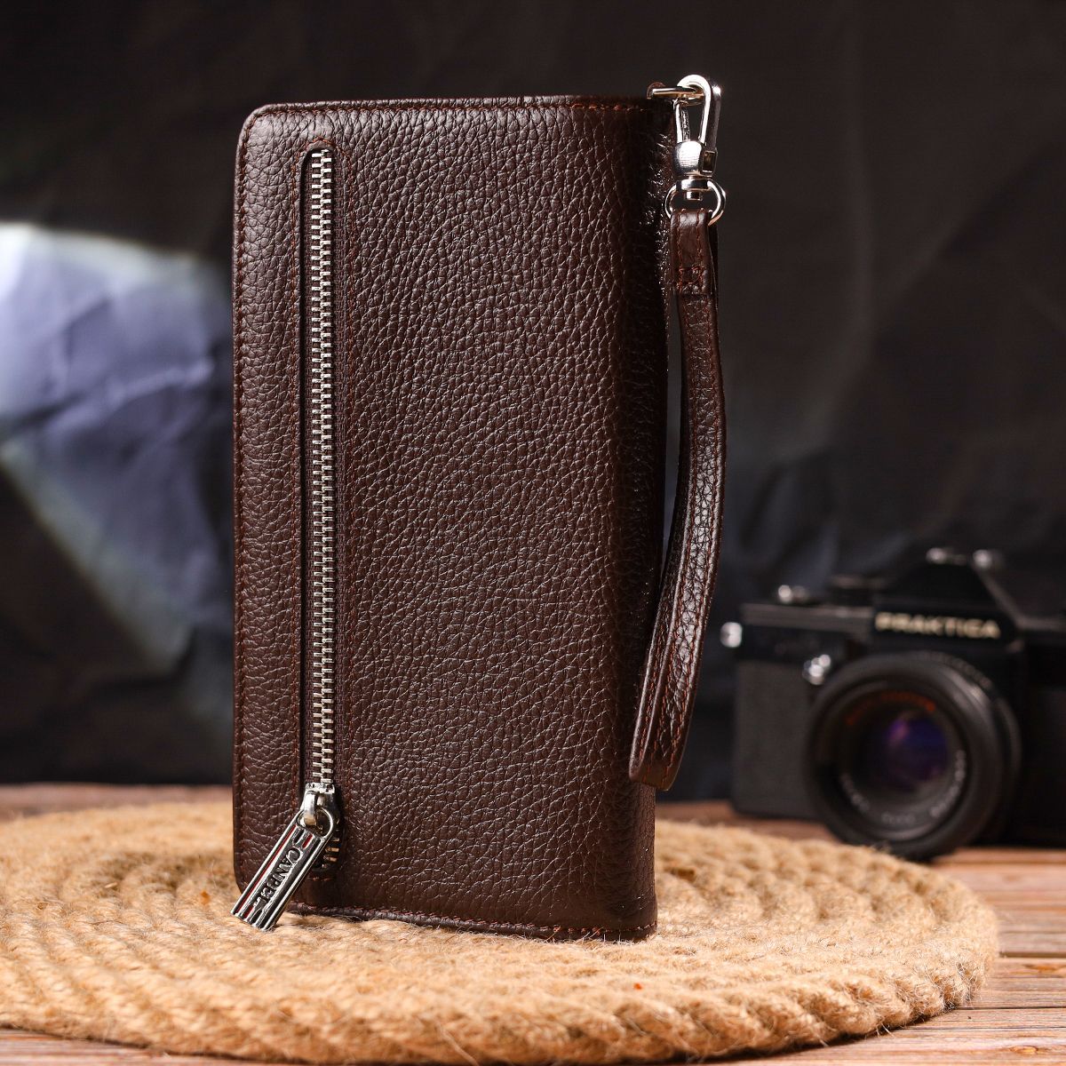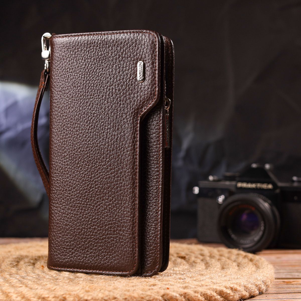Сучасний гаманець-клатч, з натуральної зернистої шкіри, в стильному коричневому кольорі. Аксесуар має одне основне відділення, в яке поміщаються купюри всіх номіналів, дванадцять кишень для карток, один з яких під сіточкою, блок для карт із зовнішнього боку, дві кишеньки на блискавці, знімний кистьовий ремінь. Закривається аксесуар на блискавку, а блок для карток закривається на кнопки. Колір фурнітури – срібло. Шкіряний гаманець є дивовижним подарунком на всі випадки життя.