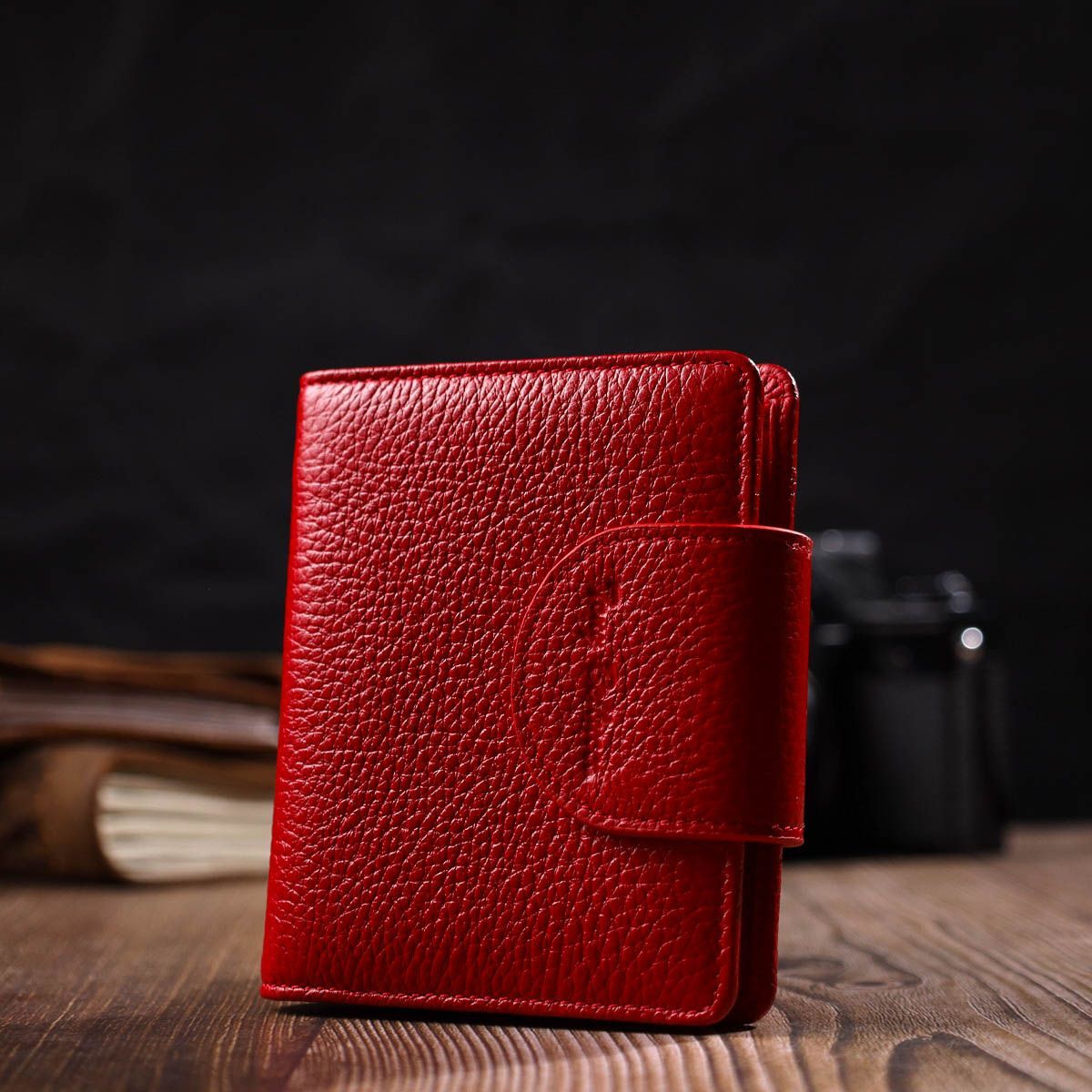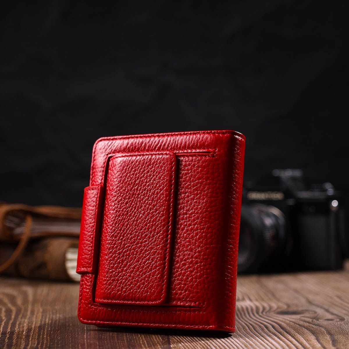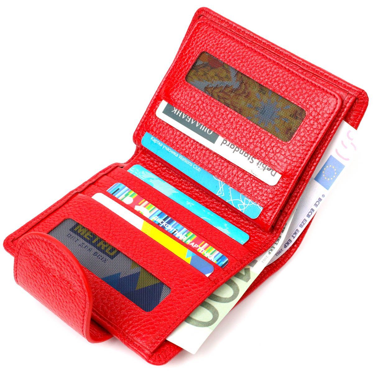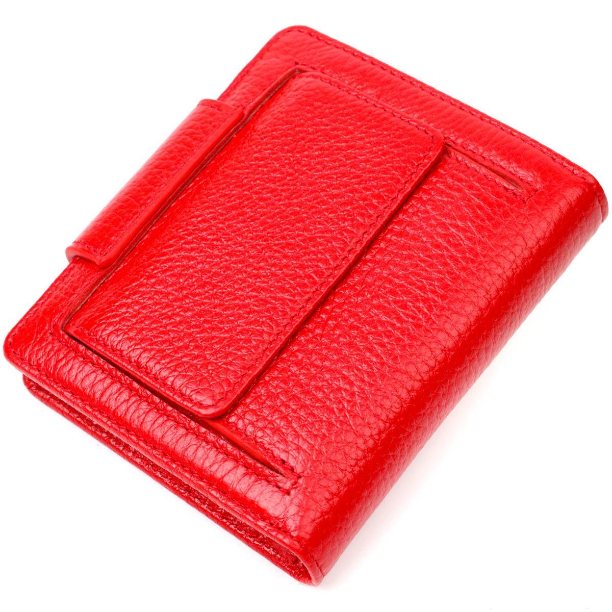 Яскравий місткий жіночий гаманець із натуральної шкіри. Аксесуар складається з двох широких відділень для купюр, дев'яти осередків для пластикових карток, двох прилеглих кишень, кишені під сіточкою та монетниці під клапаном зовні. У виробі використано якісну фурнітуру золотистого кольору. Закривається гаманець шкіряним хлястиком на кнопку. Купуючи цей шкіряний гаманець, Ви не тільки набуваєте стильної речі, але й отримуєте якісний аксесуар, який прослужить не один рік.