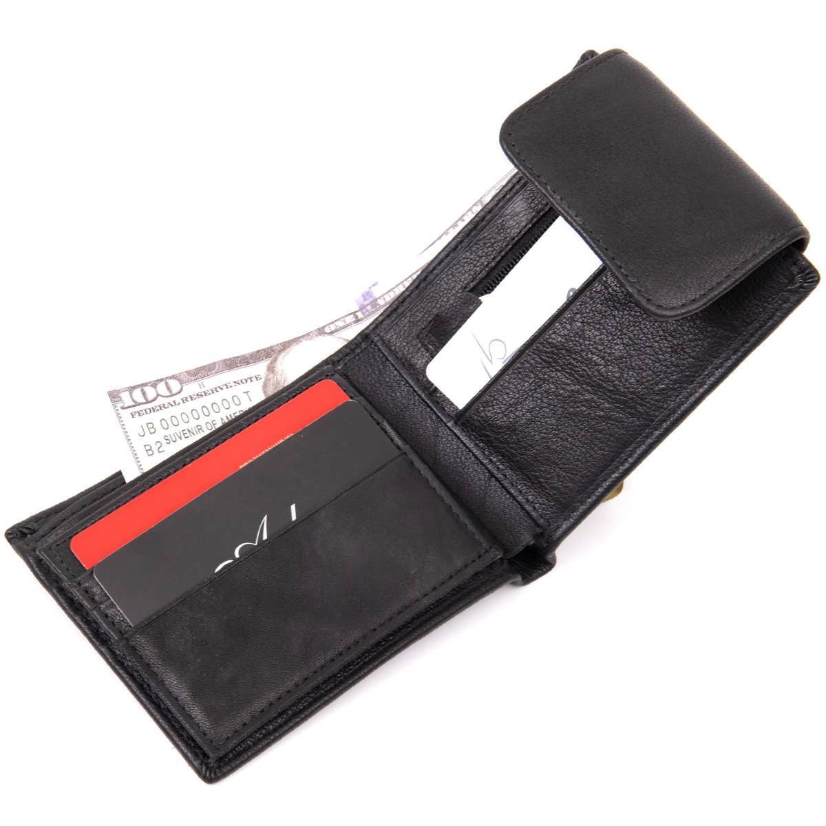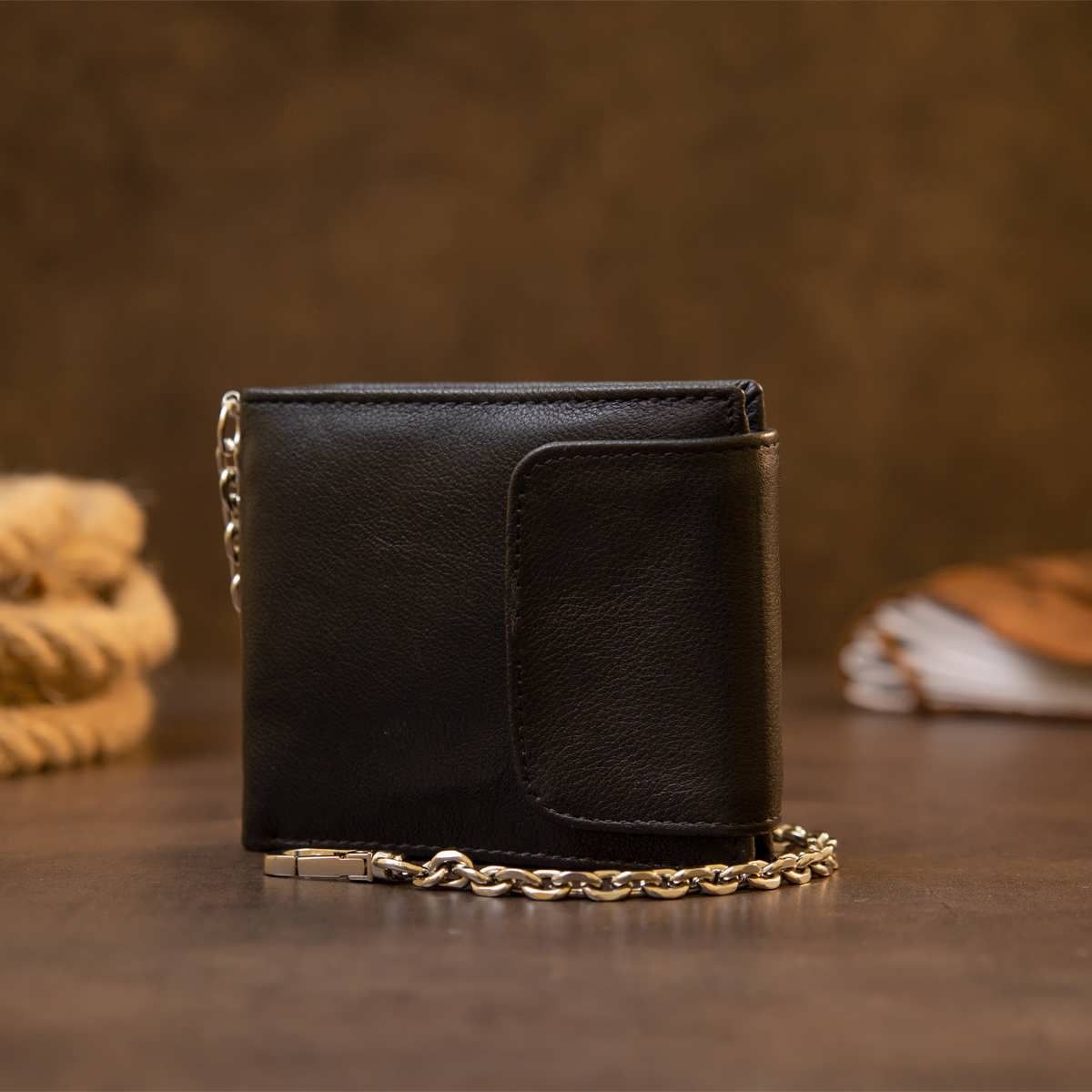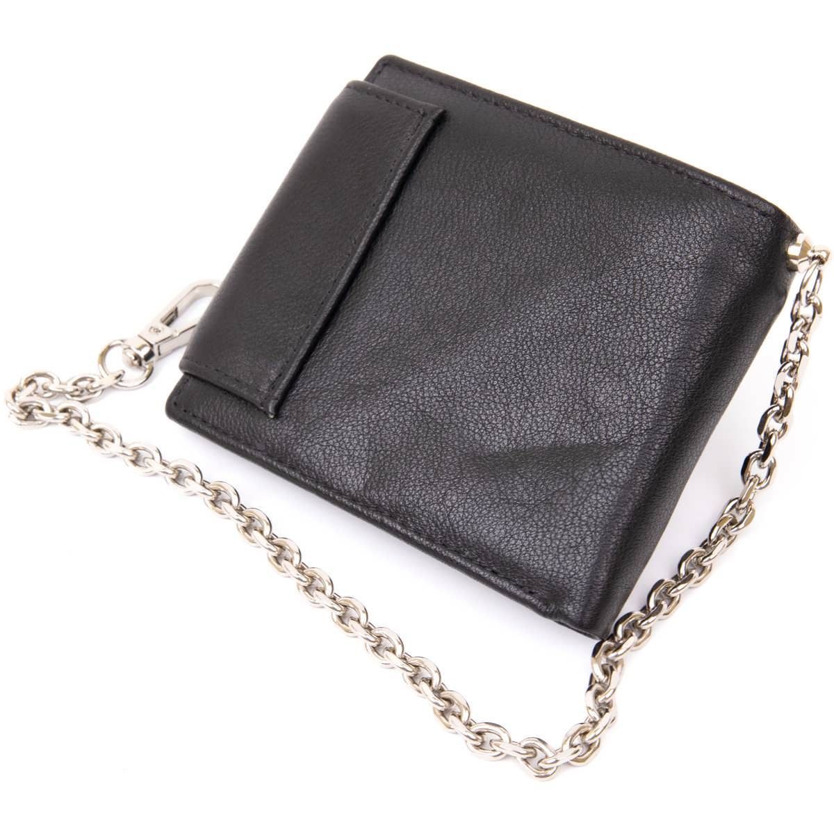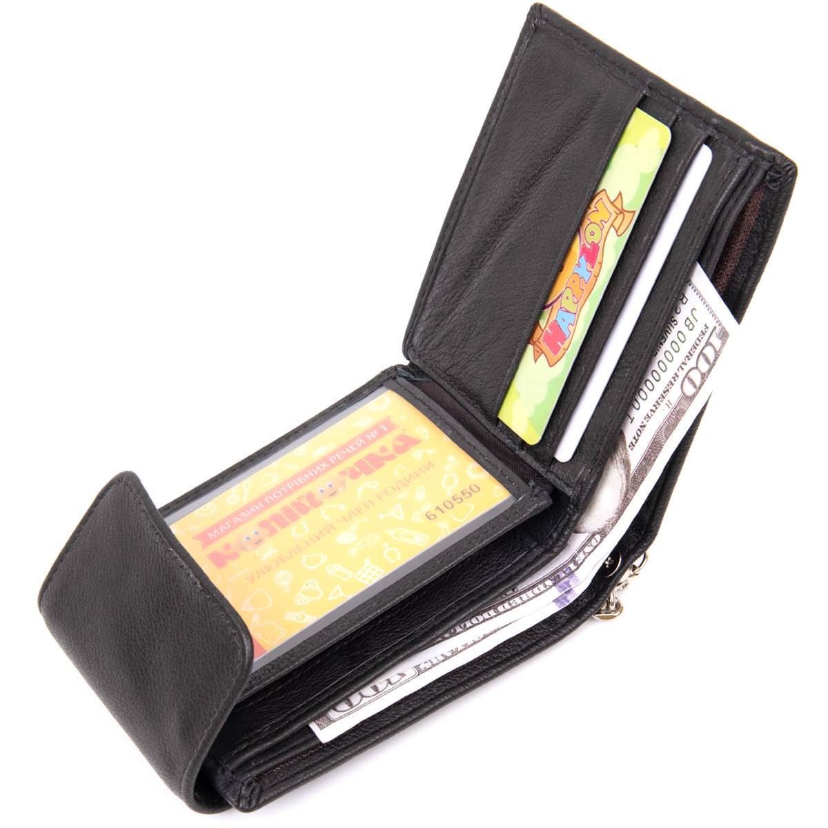 Портмоне для чоловіків і жінок у класичному чорному кольорі з невимушеним дизайном. Тонкий та м'який шкіряний портмоне зі слотами для кредиток кишенькою для монет та відділеннями для купюр. Аксесуар дуже стильний і доповнений найнеобхіднішим функціоналом без зайвих деталей. Портмоне має ланцюжок із карабіном. За неї ви зможете підчепити ваш аксесуар за лямки пояса і таким чином забезпечити йому додаткову безпеку від крадіжки. Хочемо відзначити, що ланцюжок у моделі не знімається. Купюри містяться у розгорнутому вигляді. Аксесуар – найкращий подарунок як для себе, так і на подарунок.