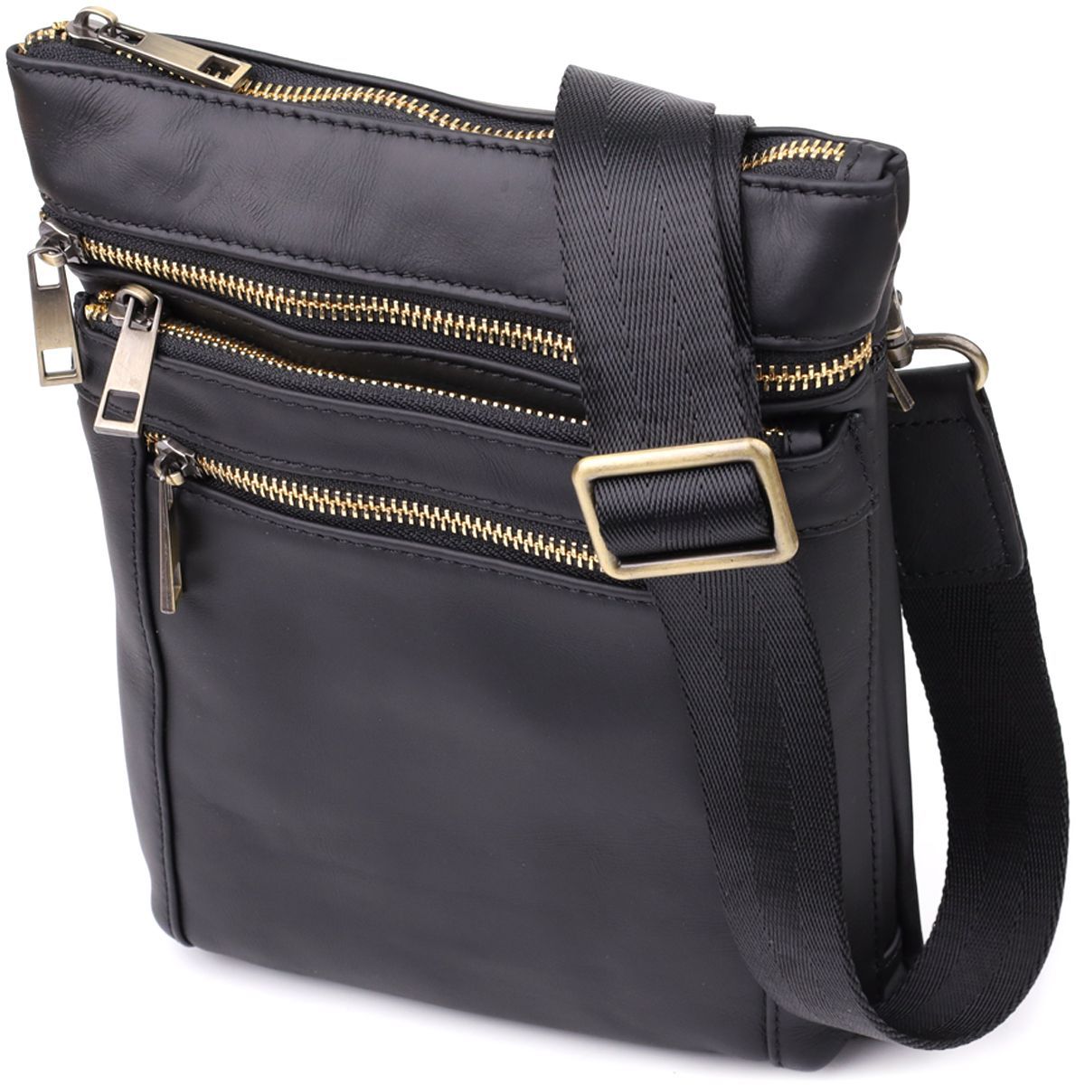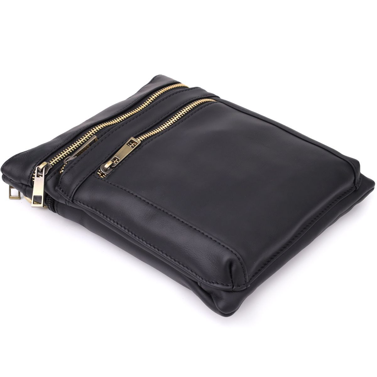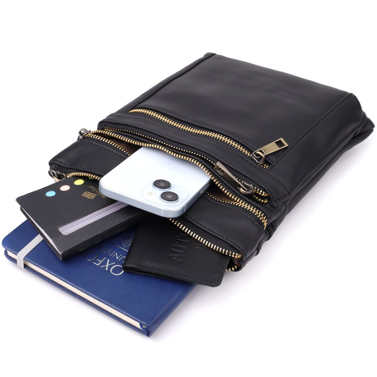 Чоловіча шкіряна сумка в чорному кольорі виготовлена з гладкої натуральної шкіри з благородним матовим блиском. Цей лаконічний та функціональний аксесуар поєднує у собі стриманий стиль та продуману ергономіку, ідеально підходячи для повсякденного використання у міському ритмі.