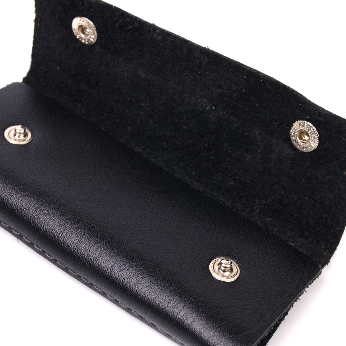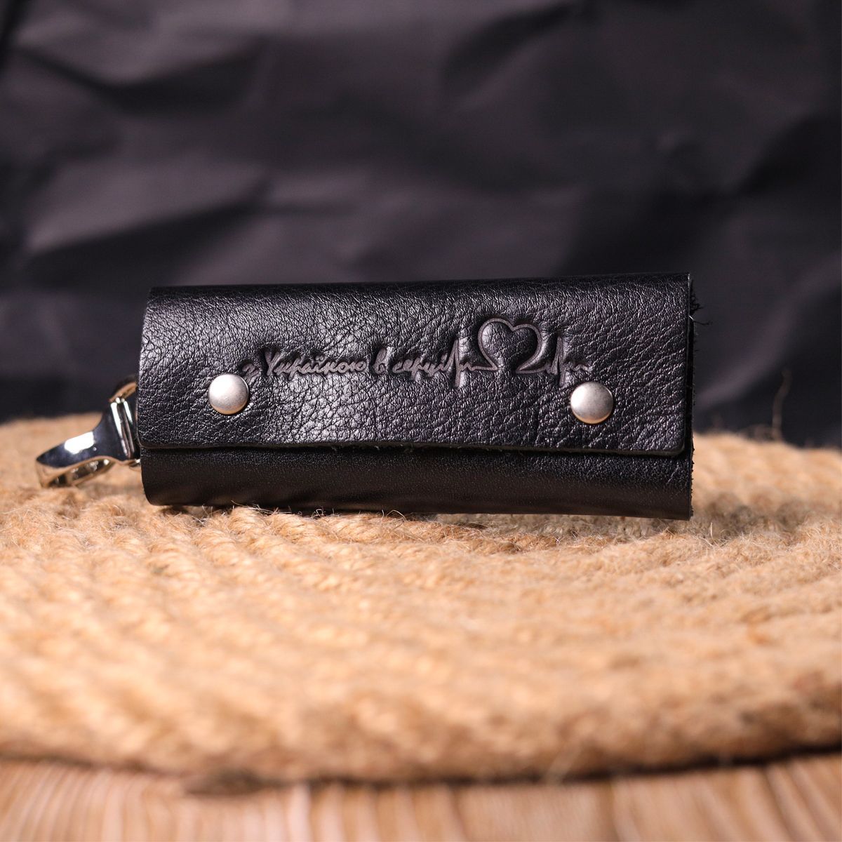 Практична шкіряна ключниця на кнопках з патріотичним тисненням на лицьовій стороні “З Україною в серці”. Виріб пошитий з гладкої шкіри, з високими показниками зносостійкості. В аксесуарі використано надійну фурнітуру, кольору срібла. Вироби зі шкіри завжди вважалися відмінним подарунком, незалежно від статі та віку.