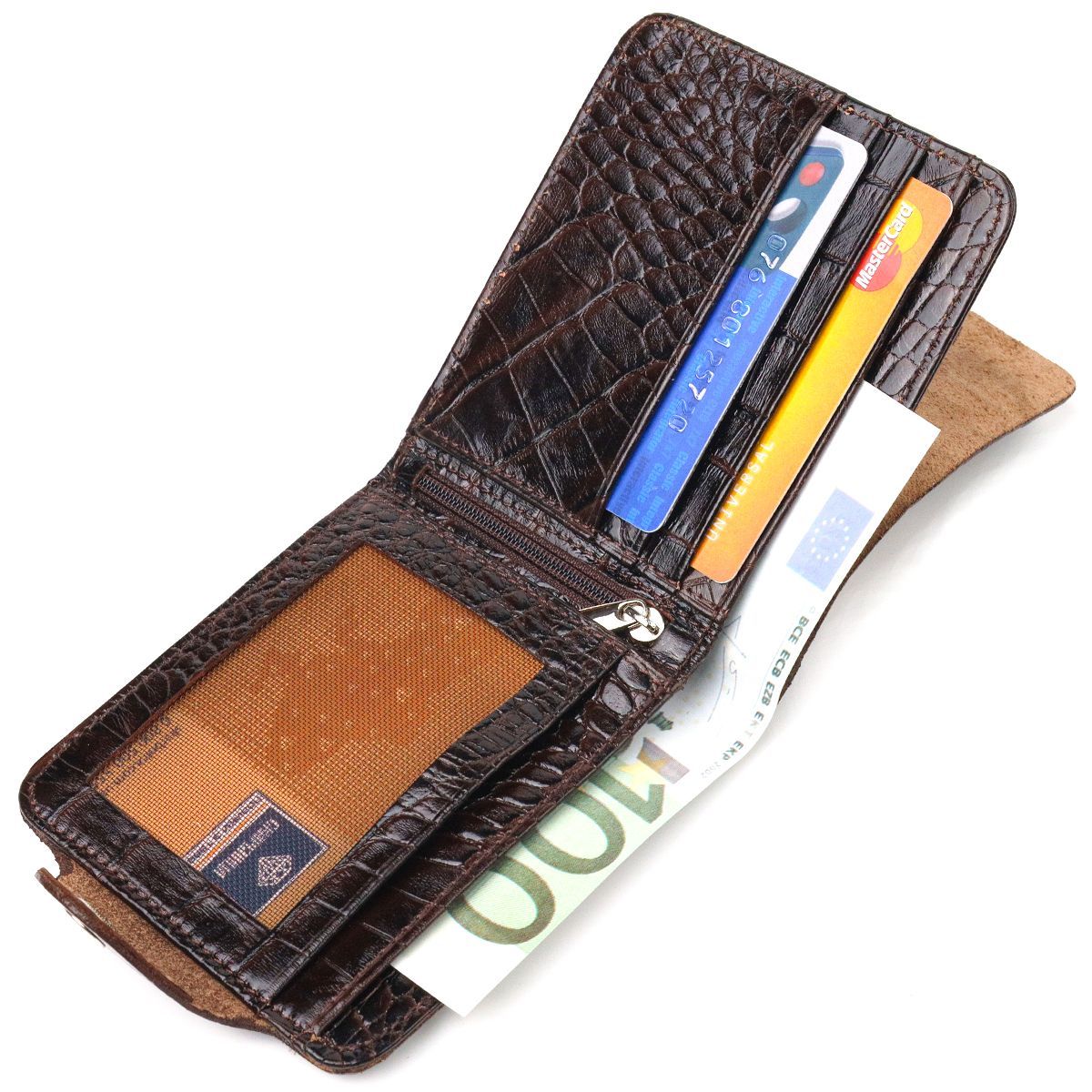 Гарний чоловічий гаманець з натуральної фактурної шкіри з тисненням під крокодила. Аксесуар має одне відділення для купюр, в яке розміщуються купюри всіх номіналів, чотири прилеглі кишені, кишеня на блискавці, на всю довжину гаманця, а також вісім відсіків для карток, один з них під сіточкою. Модель закривається хлястиком на кнопку. У сучасному світі шкіряне портмоне є просто необхідною річчю, а якісне шкіряне портмоне є ще й непоганим вкладенням грошей, оскільки прослужить не один рік.