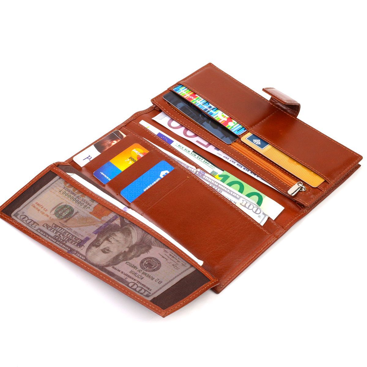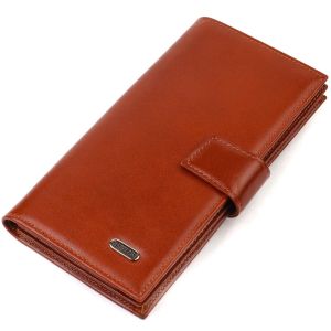 Надійний вертикальний чоловічий гаманець з натуральної гладкої шкіри. Аксесуар має одне основне відділення, в яке розміщуються купюри всіх номіналів, п'ятнадцять кишень для карток, кишеня під сіточкою для документів, дві прилеглі кишені та монетницю. Закривається аксесуар навпіл шкіряним хлястиком на кнопку. Запакований гаманець картонну коробку.
