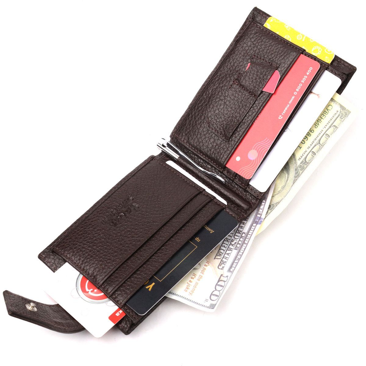 Функціональний затискач для купюр виконаний із добротної натуральної шкіри, коричневого кольору. Купюри фіксуються металевим утримувачем. Користь затиску полягає в тому, що він набагато компактніший, ніж гаманець, легко поміщається в руку або кишеню. Крім того, аксесуар надійніше та безпечніше закріплює гроші, тому краще вибрати саме його. Аксесуар упакований у фірмову коробочку. Вироби з натуральної шкіри завжди будуть чудовим подарунком для близької людини.