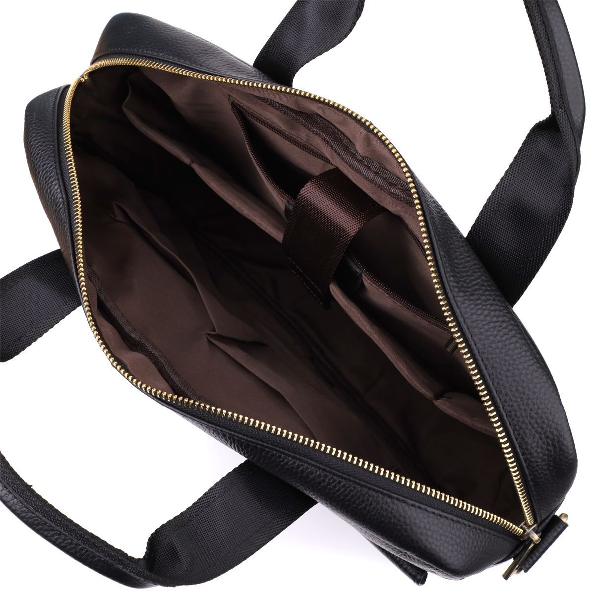 Портфель оснащений одним основним відділенням на блискавці. Усередині — продумана організація: кишеня на блискавці, дві відкриті кишені для дрібних аксесуарів і окремий відсік з фіксацією на липучку, що підходить для ноутбука діагоналлю до 15 дюймів. Всі елементи розміщені так, щоб забезпечити швидкий доступ до важливих речей та зручність у використанні.
