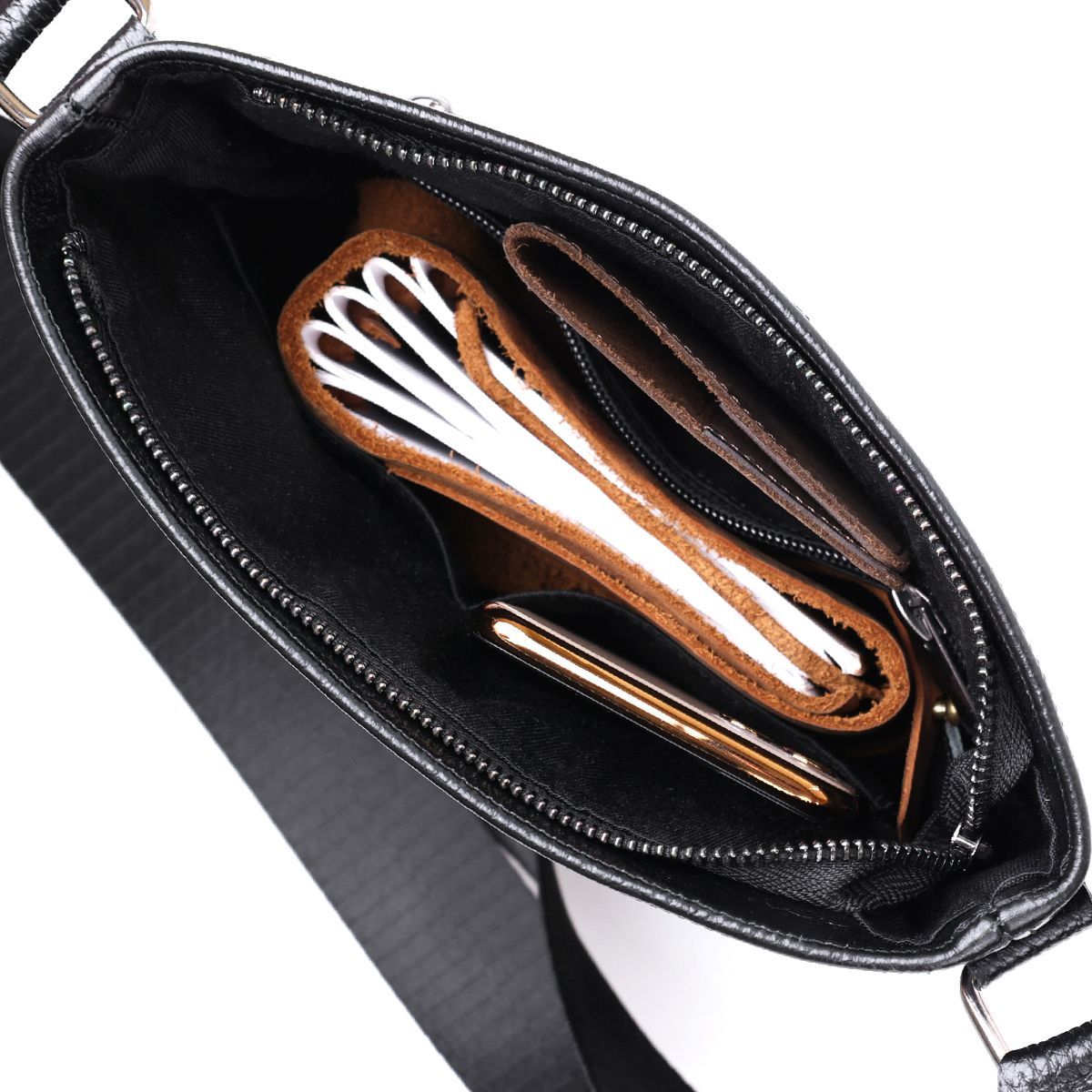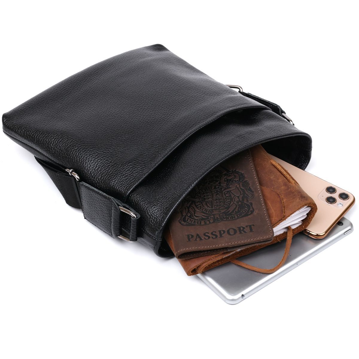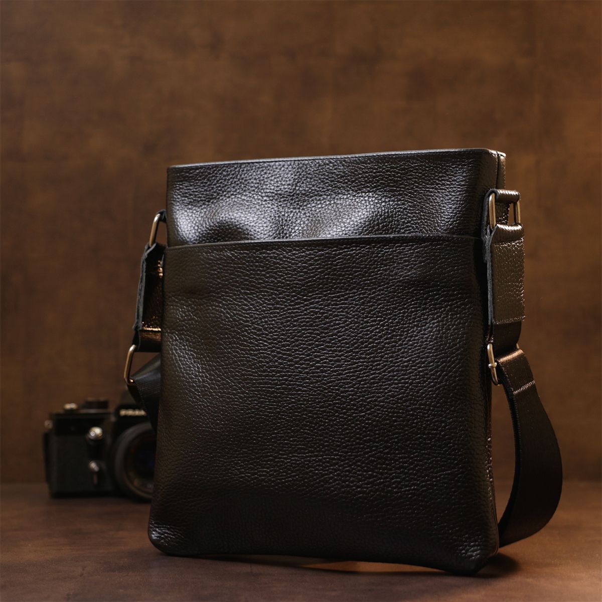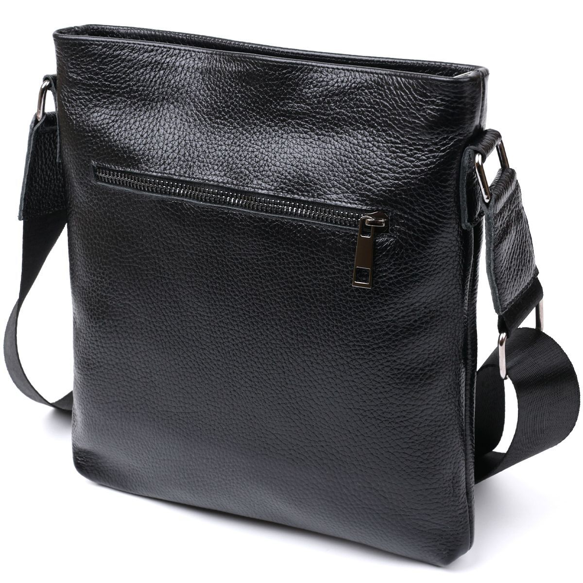 Стильна чоловіча сумка з ременем через плече із натуральної шкіри високої якості. Має універсальний чорний колір, тому підійде під одяг будь-якого стилю та кольору. Дана модель має містке основне відділення та дві кишені на зовнішній стороні. Фактура аксесуара – зерниста з невеликим переливом.
