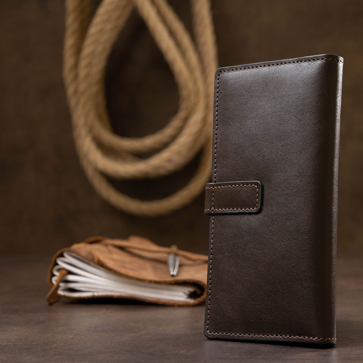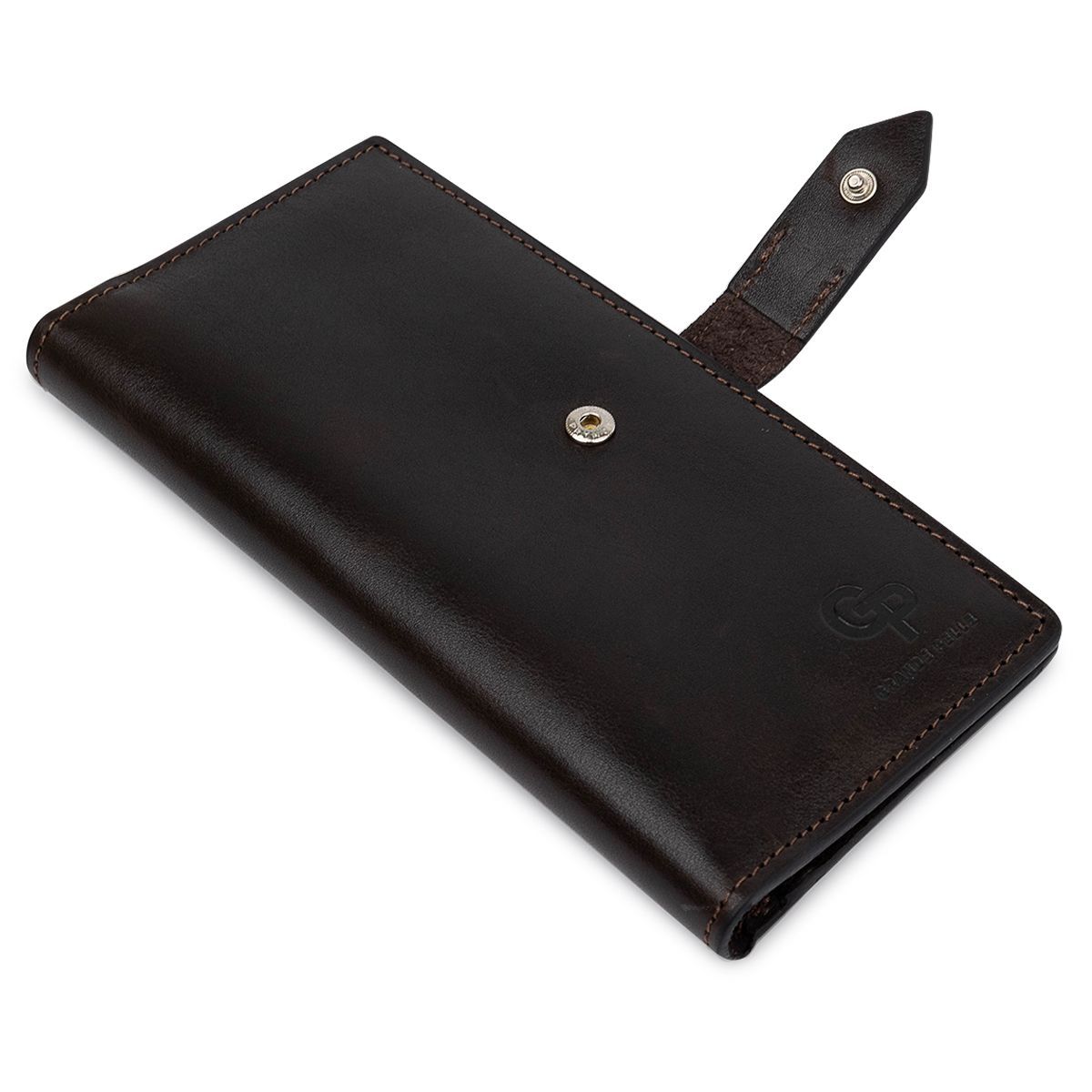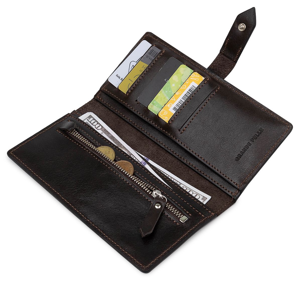 Практичний та місткий чоловічий портмоне з натуральної зносостійкої шкіри від українського виробника. Виконано у гарному шоколадному кольорі у гладкій глянсовій фактурі. Має просторі відділення для купюр, зручну монетницю на блискавці та кишені для пластикових карток або візиток. Запакований аксесуар у картонну коробку із фірмовим логотипом.