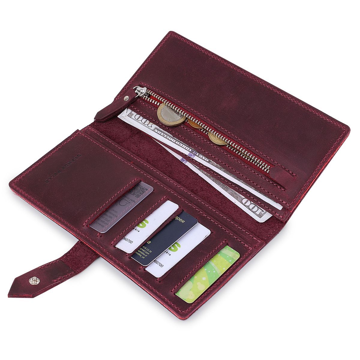 Красиве матове жіноче портмоне у бордовому кольорі з відтінком стиглої вишні. Виготовлено виріб із натуральної шкіри з високими показниками міцності. Закривається аксесуар на зручну практичну кнопку. Усередині розташувалися відділення на всю довжину для купюр, монетниця на блискавці та слоти для кредитних карток або візиток. Упаковано портмоне у фірмову картонну коробку.