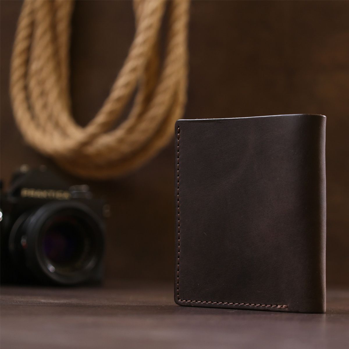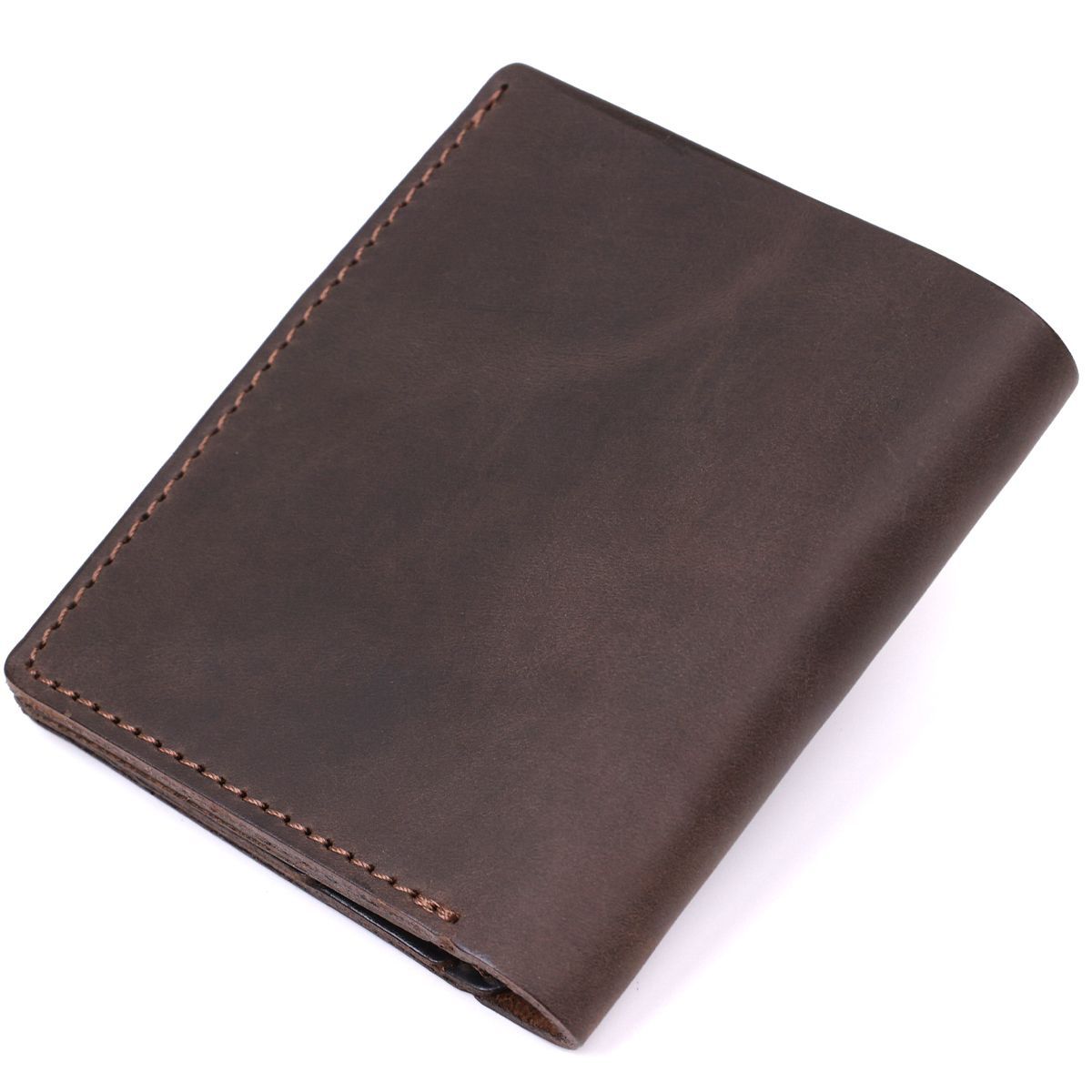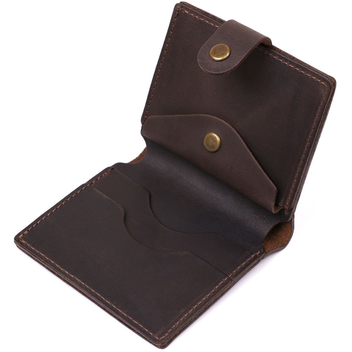 Чоловічий компактний гаманець із натуральної шкіри високого класу. Має гарний коричневий колір, вінтажну матову фактуру та гладку поверхню. Усередині є просторе відділення для купюр, слоти для пластикових карток та невелика монетниця на кнопці. Такий гаманець можна сміливо дарувати на будь-яке свято другові, колезі чи коханому чоловікові.