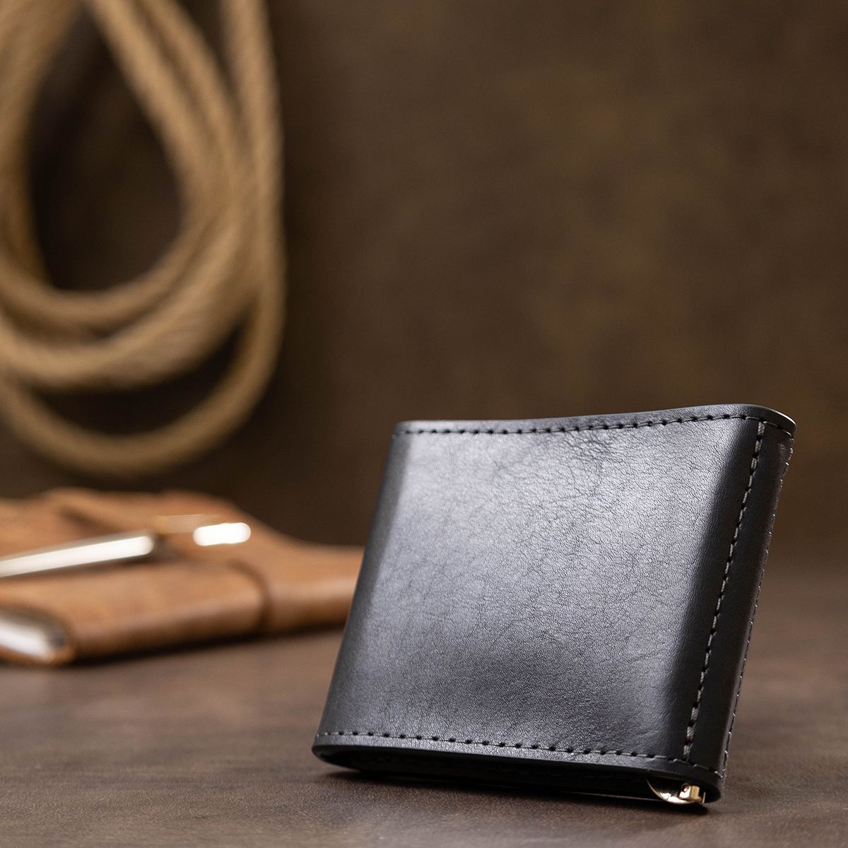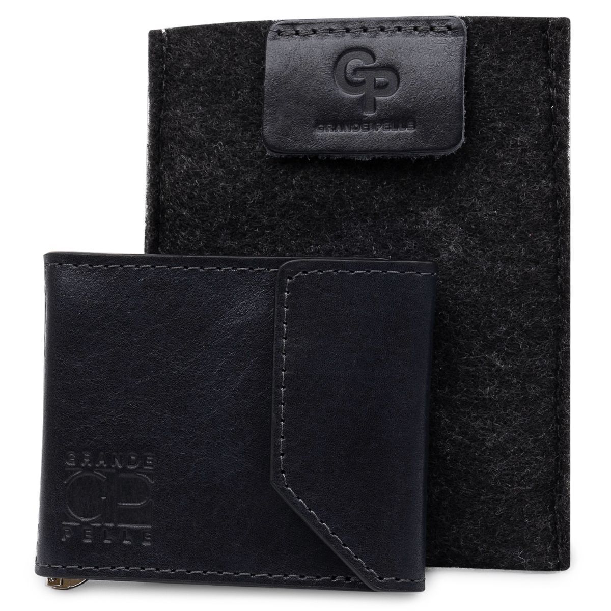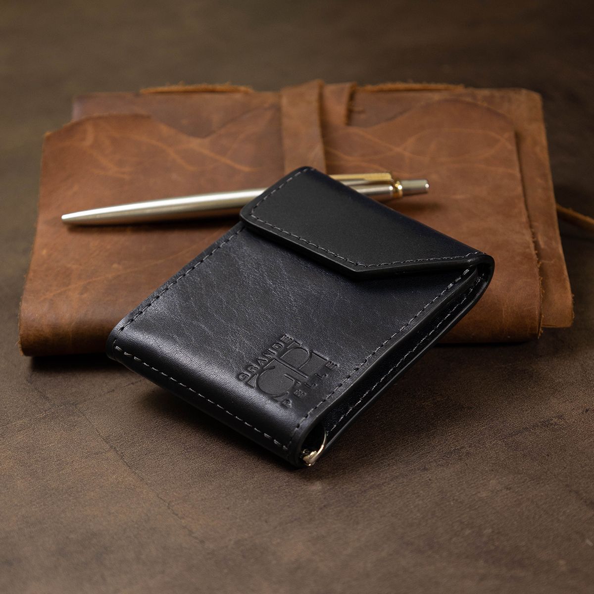 Зручний та практичний компактний затиск для грошей із висококласної шкіри, яка має відмінні експлуатаційні характеристики. Має темно-синій глибокий колір та гладку фактуру. Усередині крім металевого затиску є ще дві кишеньки для карток. Закривається виріб на невеликий клапан із прихованим магнітом.